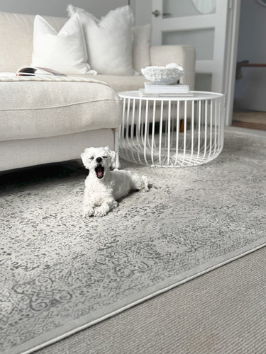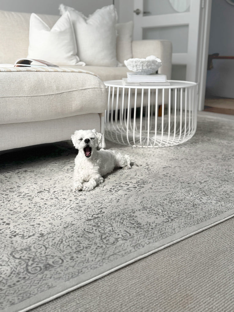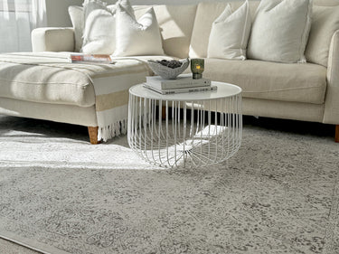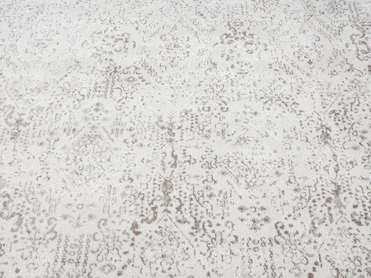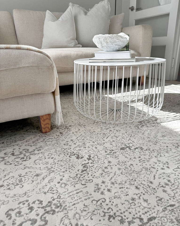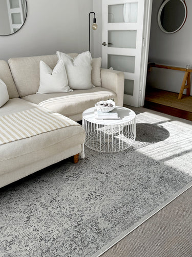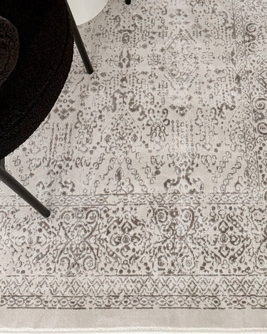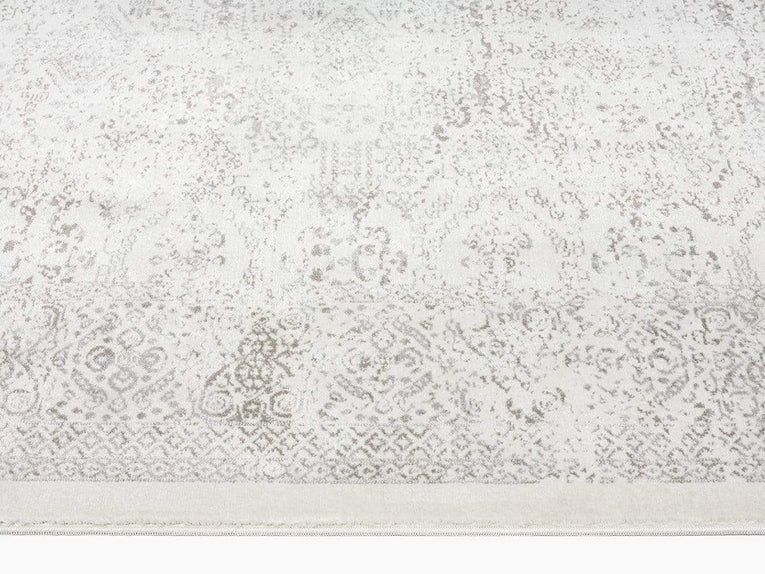 An exclusive design in the Miss Amara Collection, Madison is a bordered vintage distressed style. Decorated with elaborate floral motifs and ornate patterns in transitional multi-tones of ivory and grey. A timeless and elegant addition to a modern, classic, coastal, bohemian or vintage space.