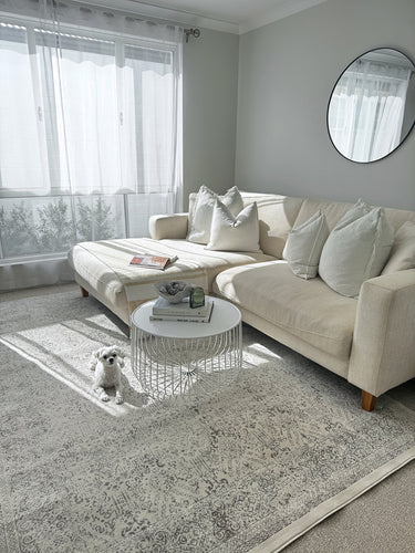 Madison is a gorgeous ivory and grey rug with a traditional style bordered floral design.