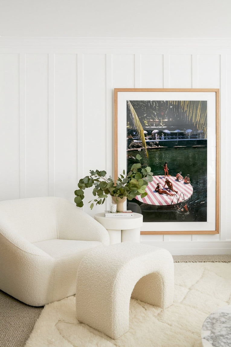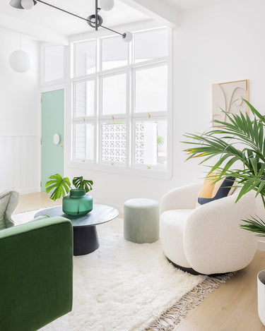 Position your rug to frame the seating area as one considered zone. Place at least the front legs of your sofa and chairs on the rug to anchor the layout.