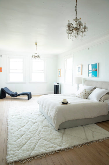 A rug introduces warmth and softness underfoot. Position it two-thirds under the bed, allowing it to extend beyond the sides and foot.