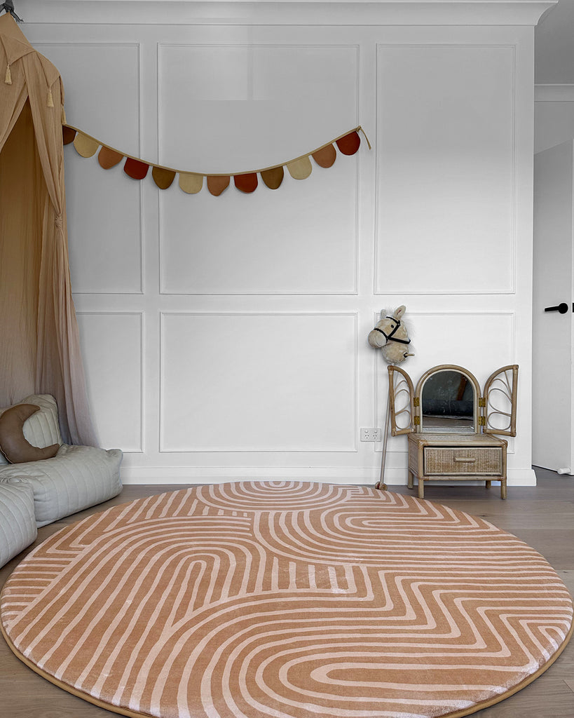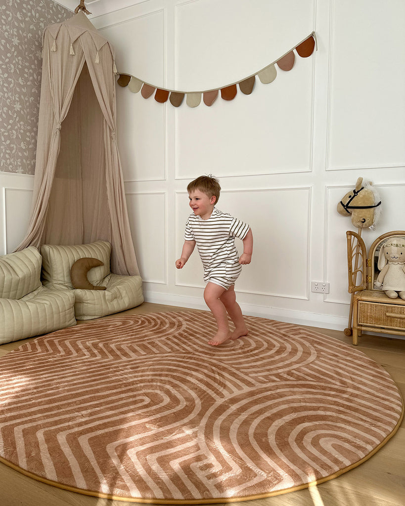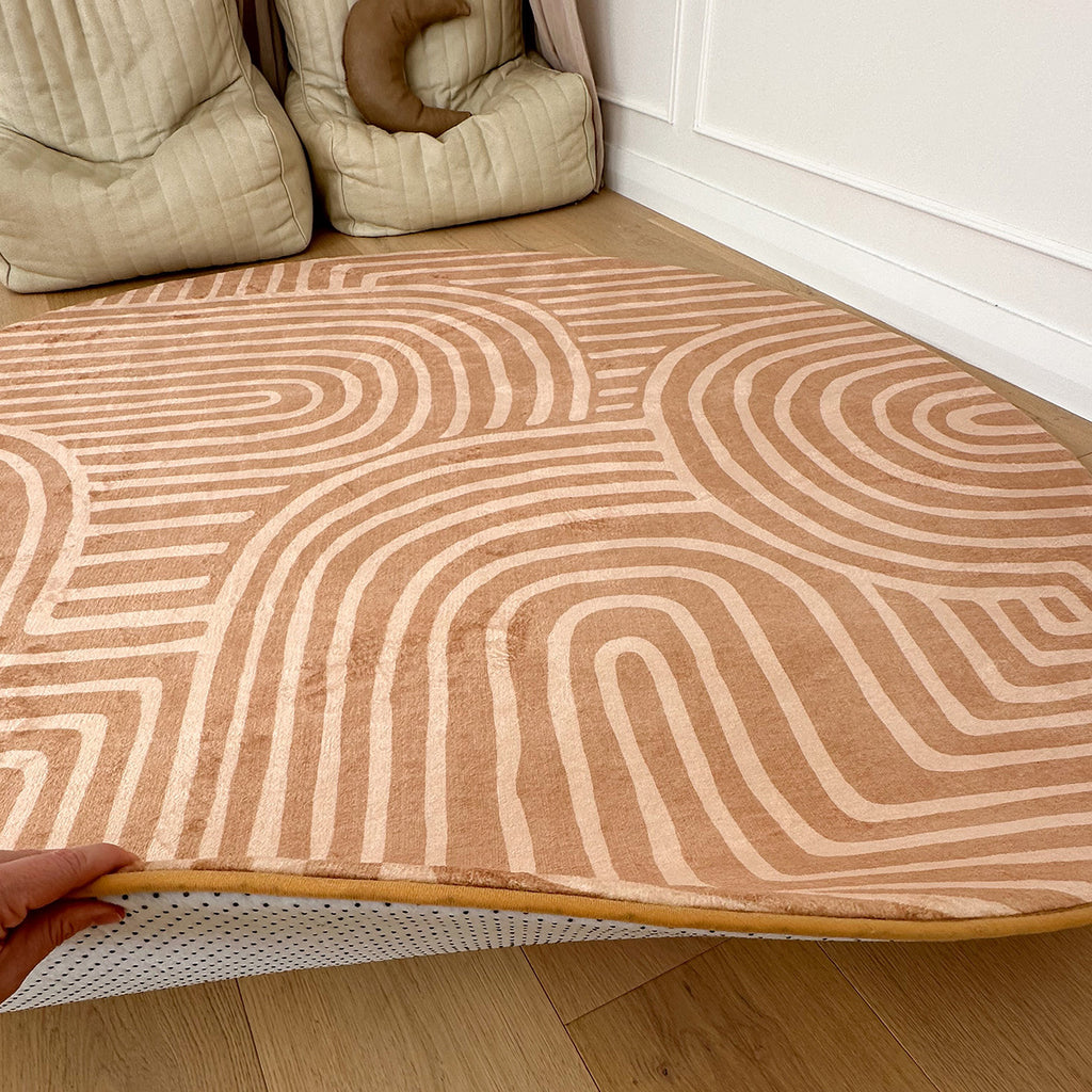 Miss Amara’s floor mats for kids feature sleek patterns and neutral tones that effortlessly complement any room.