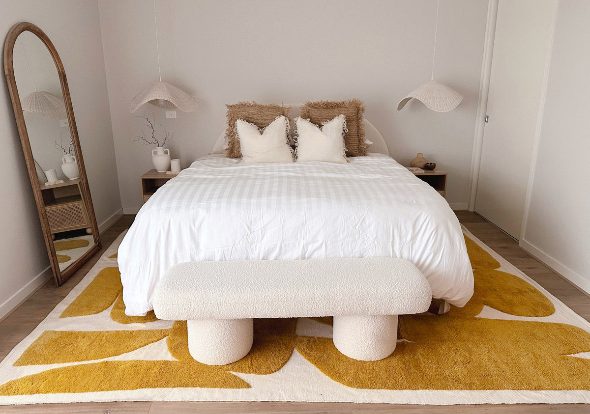 A rug introduces warmth and softness underfoot. Position it two-thirds under the bed, allowing it to extend beyond the sides and foot.