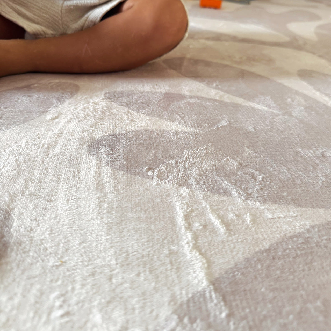 Our playmats are velvety soft to the touch with a luxe satin-smooth finish. They are thick and plush yet lightweight with a built-in non-slip underlay to keep the mat safe and in place.