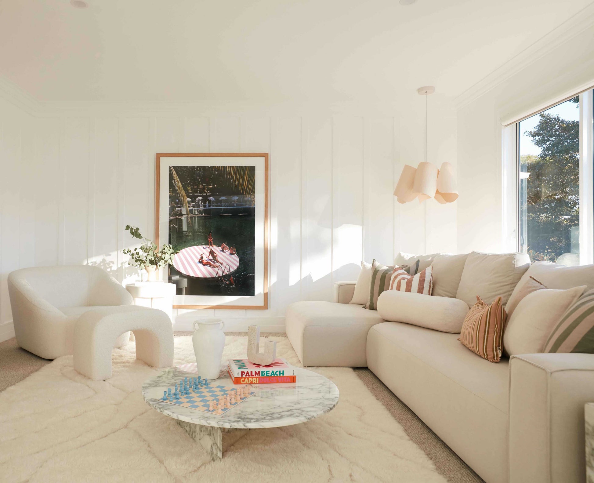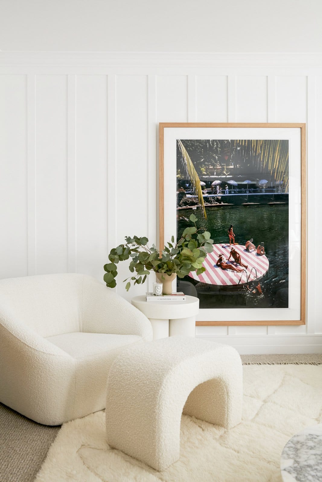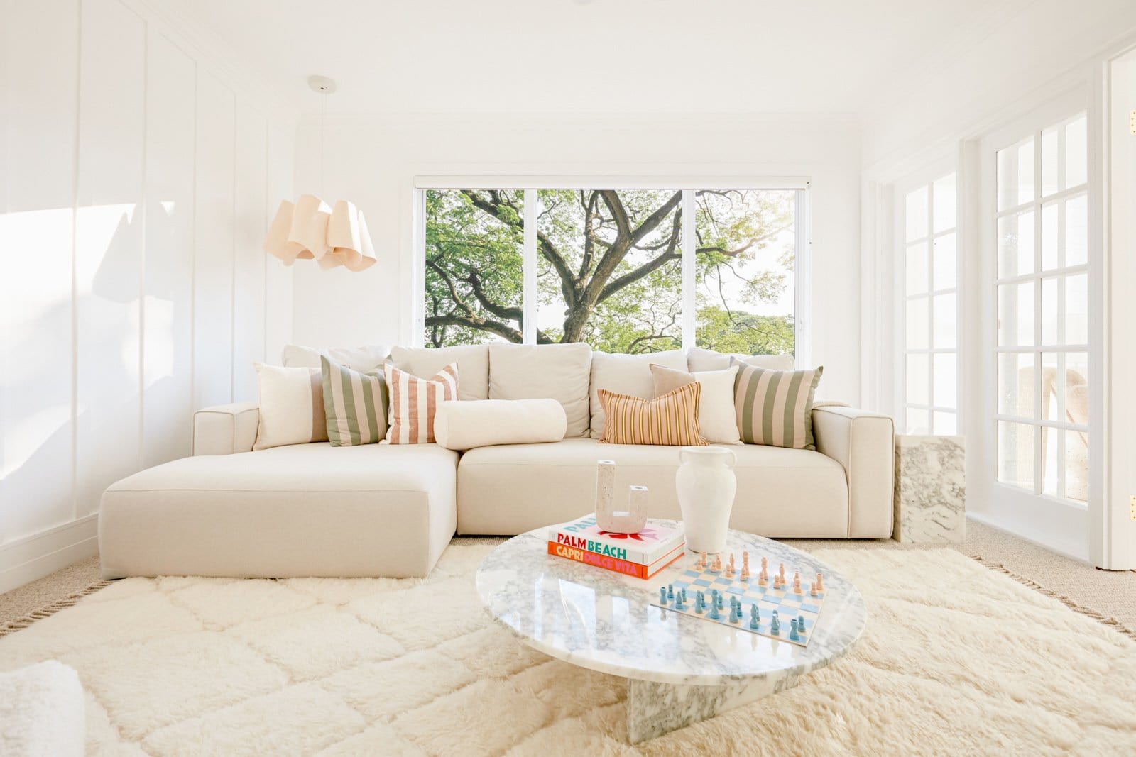 Position your rug to frame the seating area as one considered zone. Place at least the front legs of your sofa and chairs on the rug to anchor the layout.