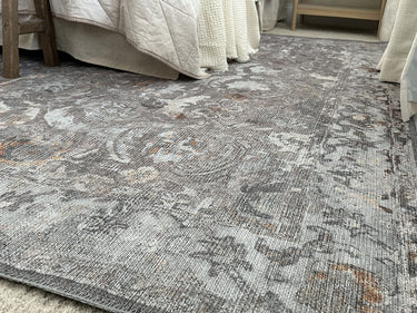 A bordered distressed style rug with elaborate motifs and ornate patterns in grey, blue and hints of golden yellow tones. The beautiful design is printed on top of the fibres giving it a faded effect with a subtle vintage look. A timeless and elegant addition to a modern, classic, bohemian or vintage space.