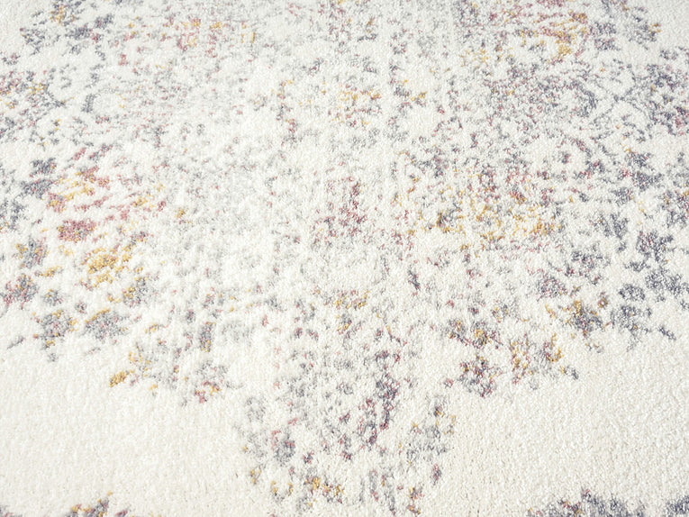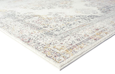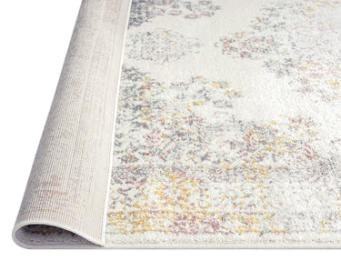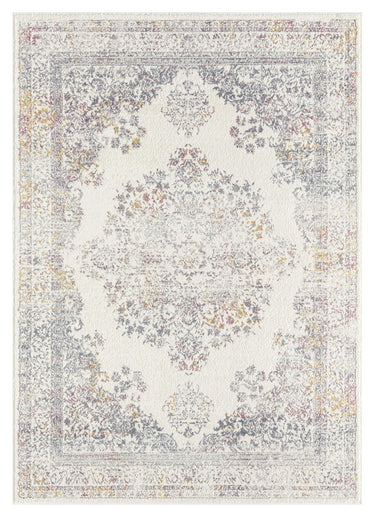 Aysha is a stunning pink, yellow and grey traditional floral medallion rug with a cream background.