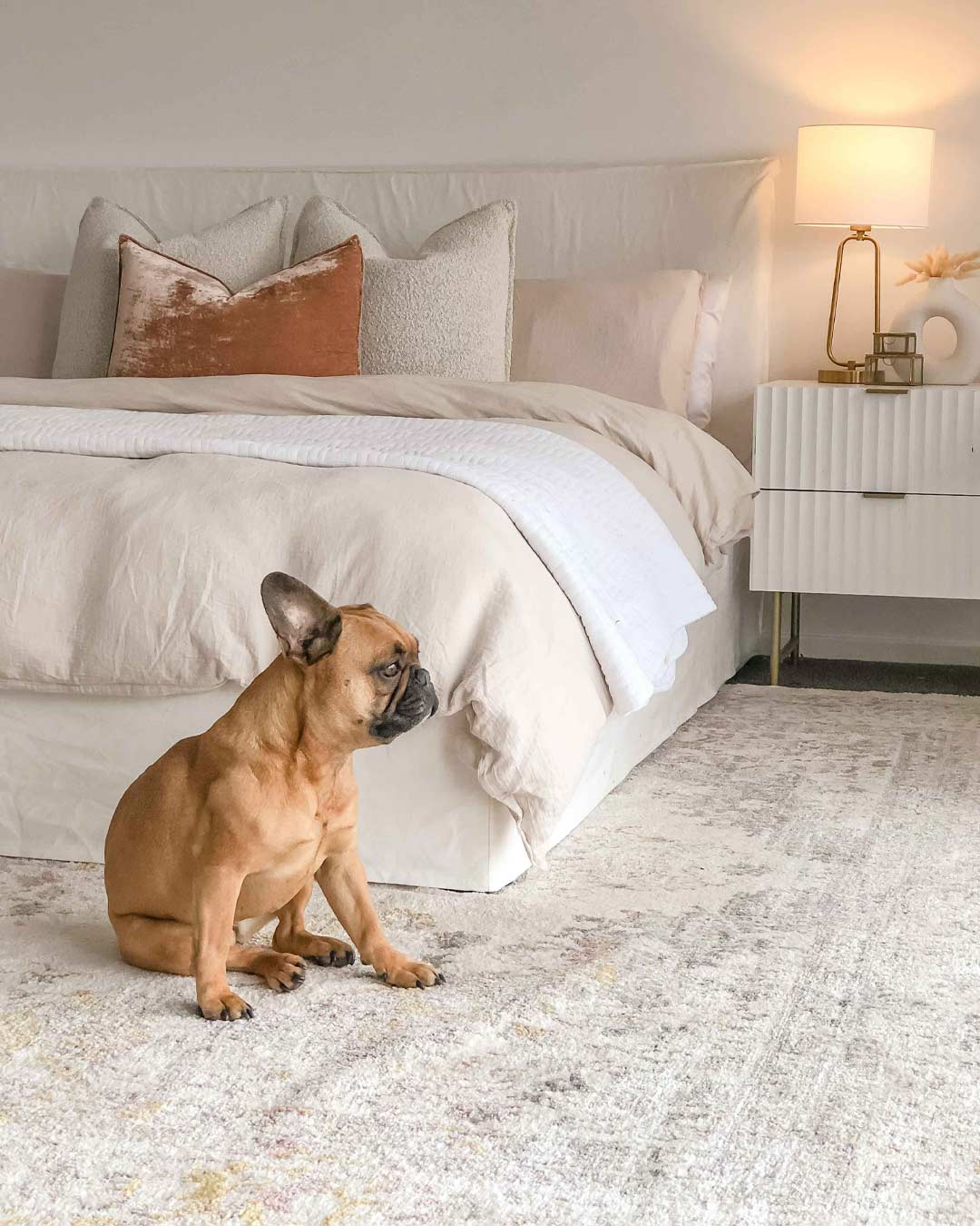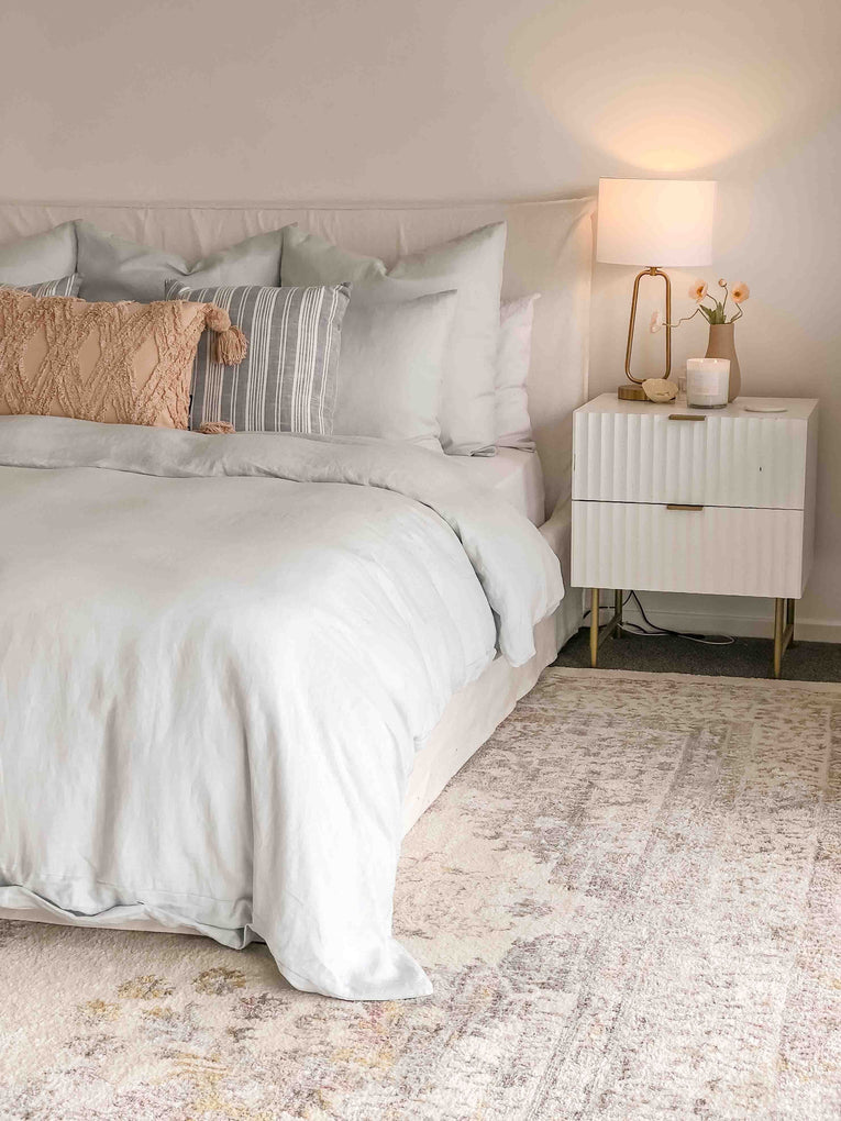 A rug introduces warmth and softness underfoot. Position it two-thirds under the bed, allowing it to extend beyond the sides and foot.