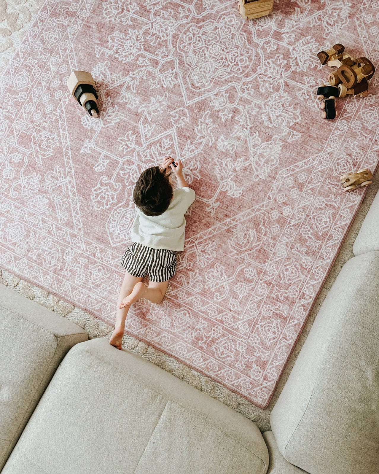 Ready to play? Our memory foam mats were created for full-on fun! Bari is a rollie pollie luxe plush playmat with an ivory traditional medallion pattern on a background of blush pink tones. Specially designed to be a super spongy soft landing for little feet (and big feet too!)