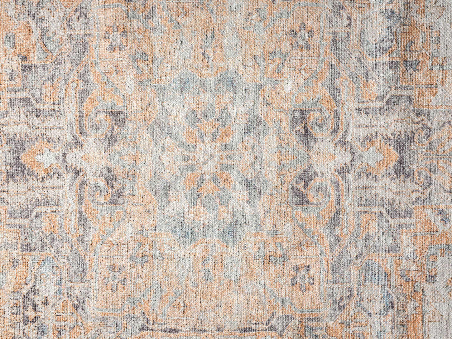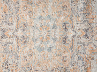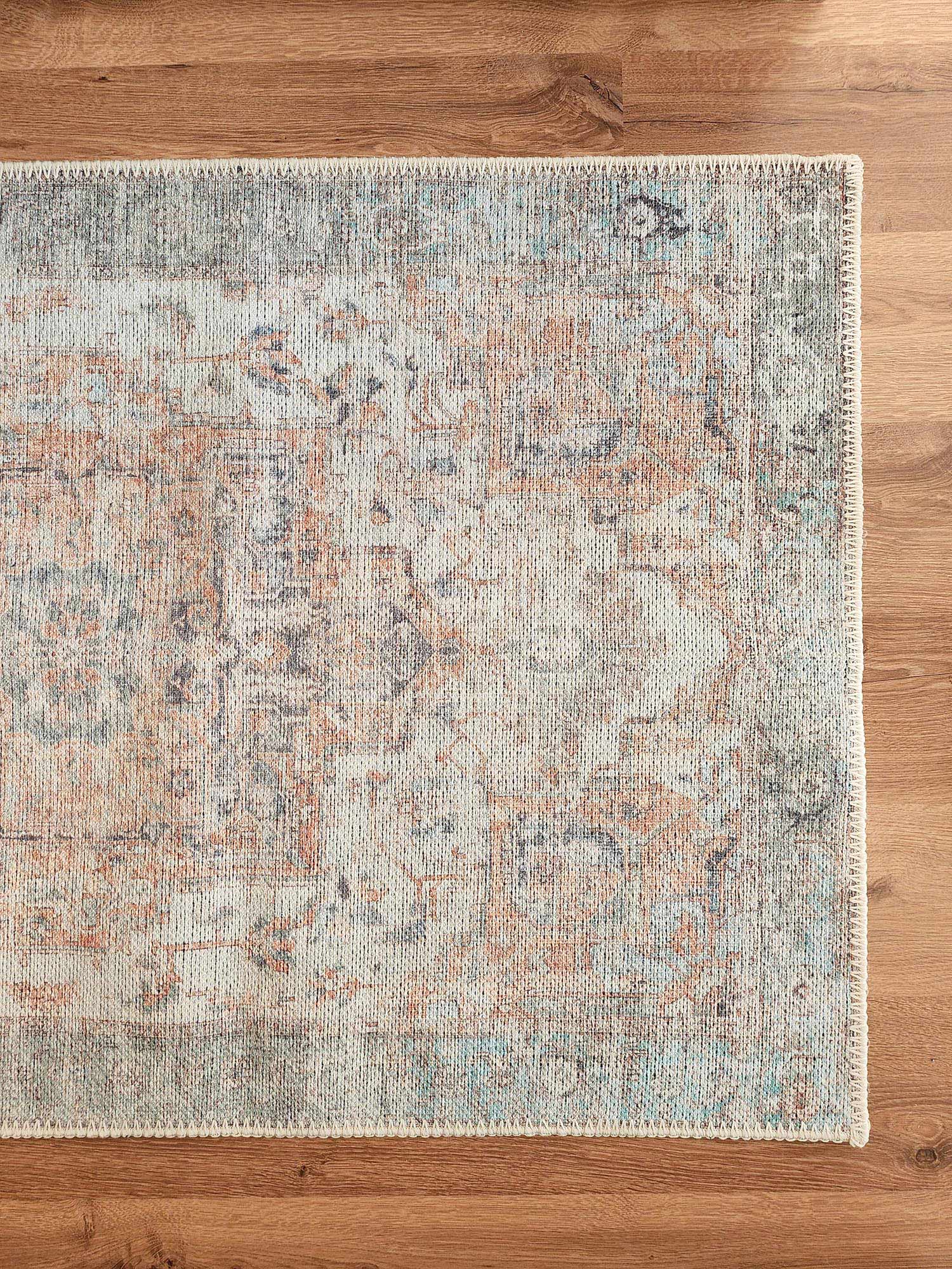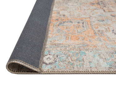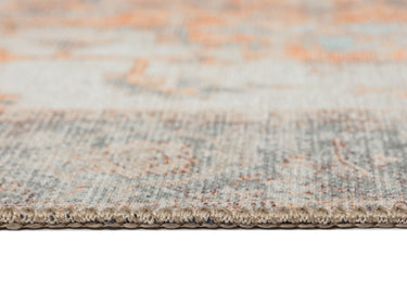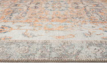 A bordered distressed style rug with elaborate motifs and ornate patterns in warm orange, neutral cream grey and hints of turquoise blue. The beautiful design is printed on top of the fibres giving it a faded effect with a subtle vintage look. A timeless and elegant addition to a modern, classic, bohemian or vintage space.