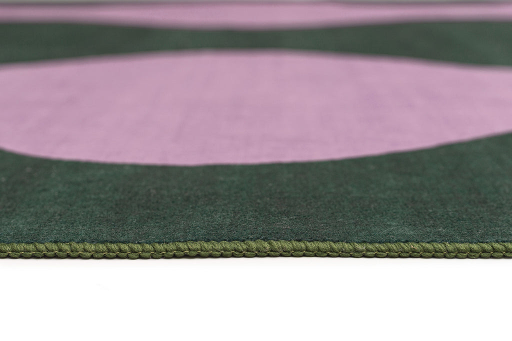 Cuenca is a washable and foldable rug defined by a flowing wave motif that brings a sense of movement and softness to a space. A warm green base is layered with soft purple curves, creating a rhythmic pattern that adds movement and visual interest to the space.