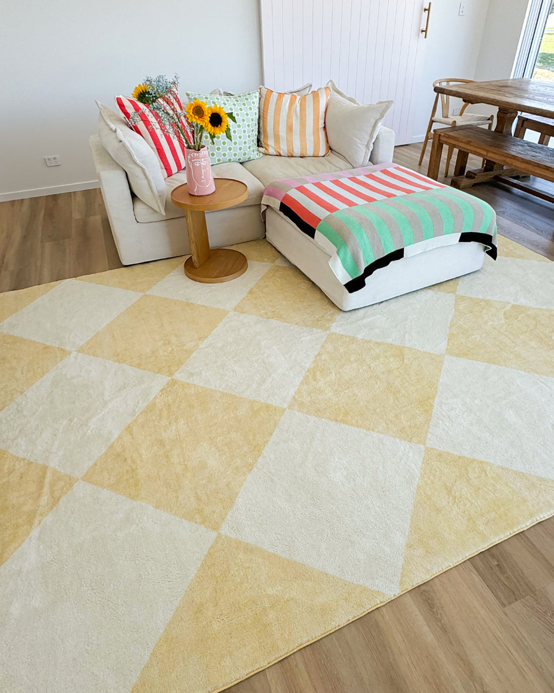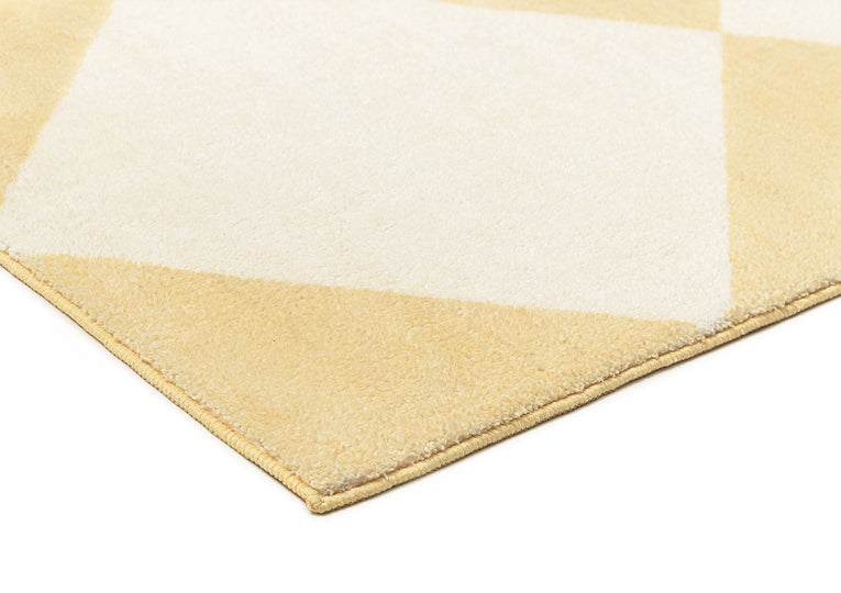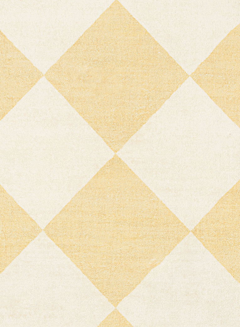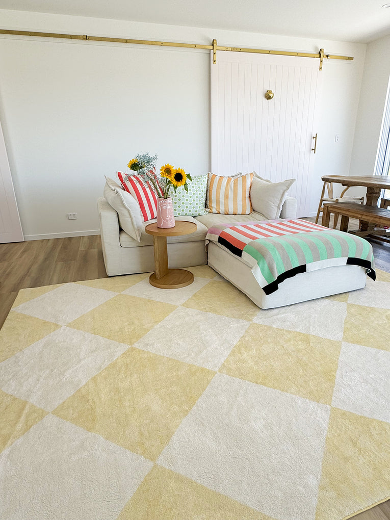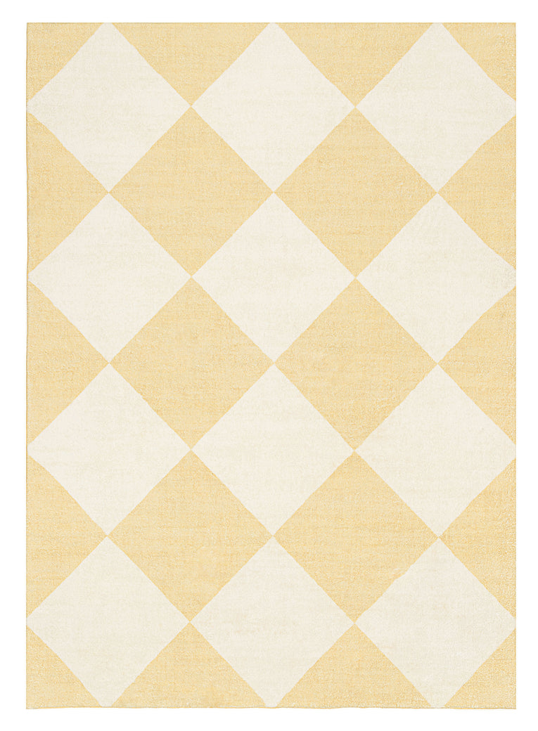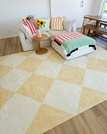 Ellis is a stunning soft plush machine washable and foldable rug featuring a checkered pattern in pastel yellow and cream tones.