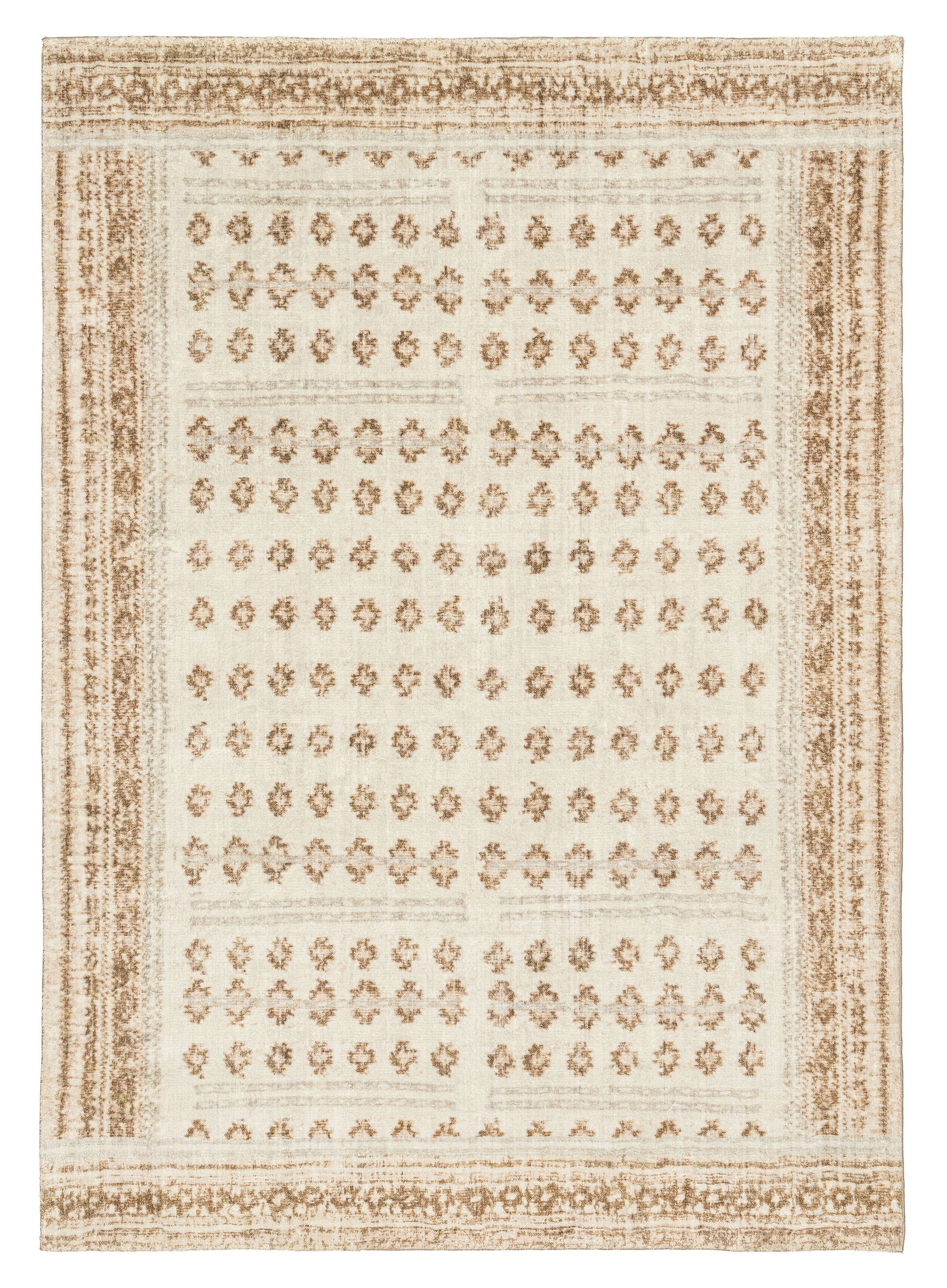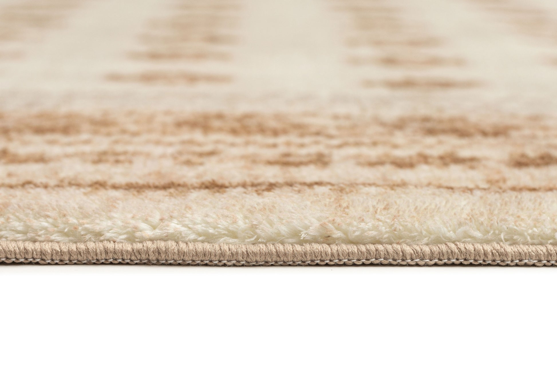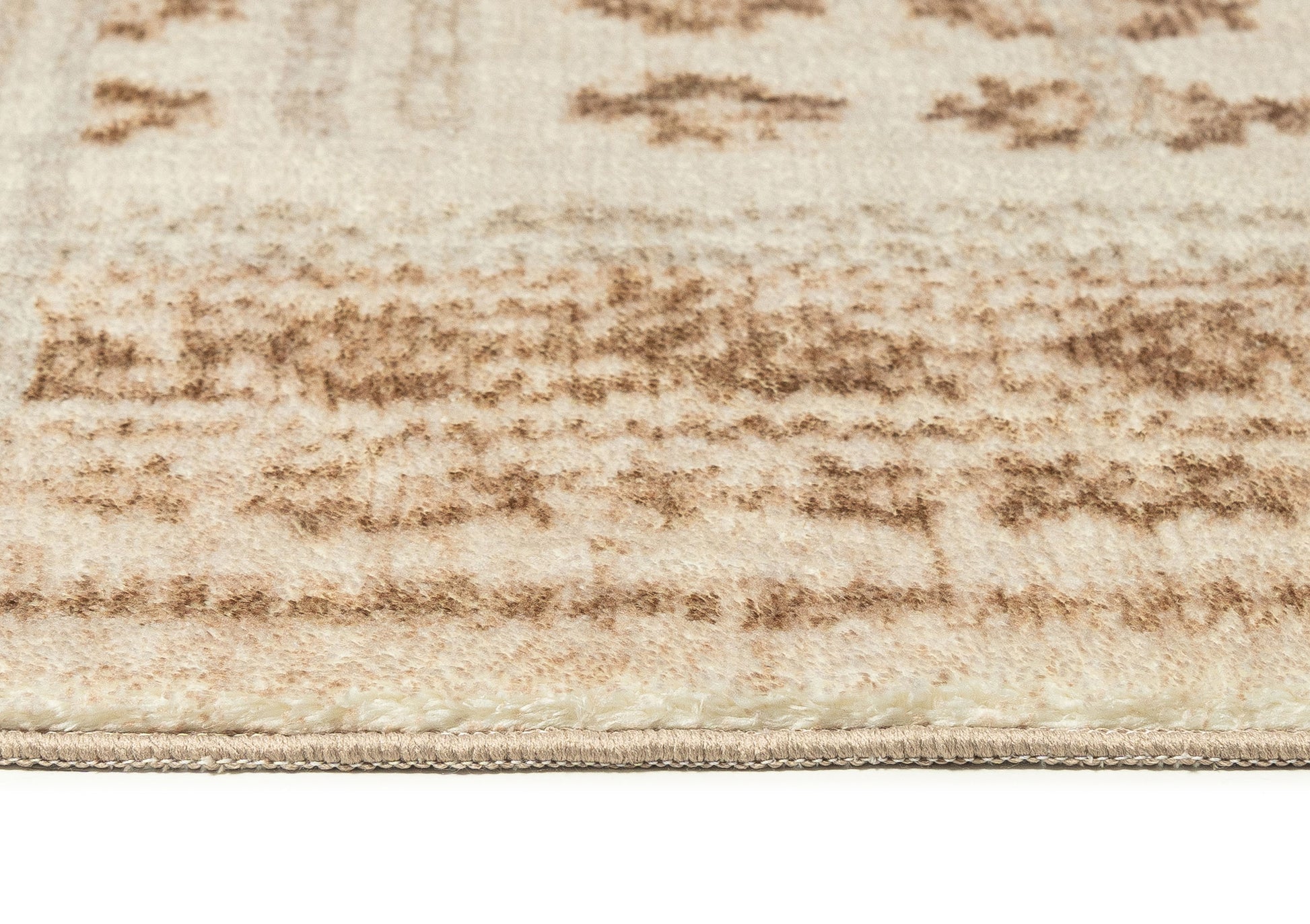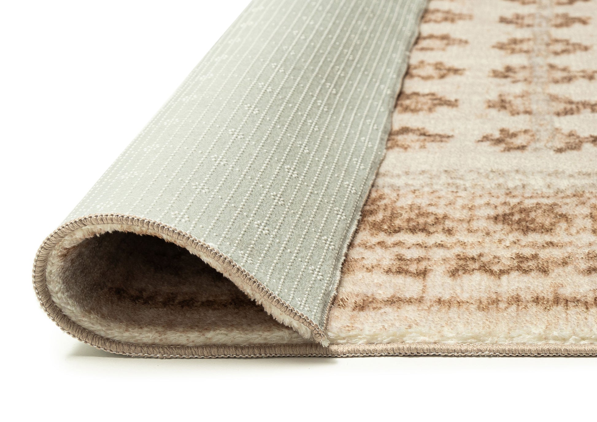 Ellora is a beautiful soft plush machine washable and foldable bordered rug featuring an abstract tribal bohemian pattern in brown, beige, and cream tones.