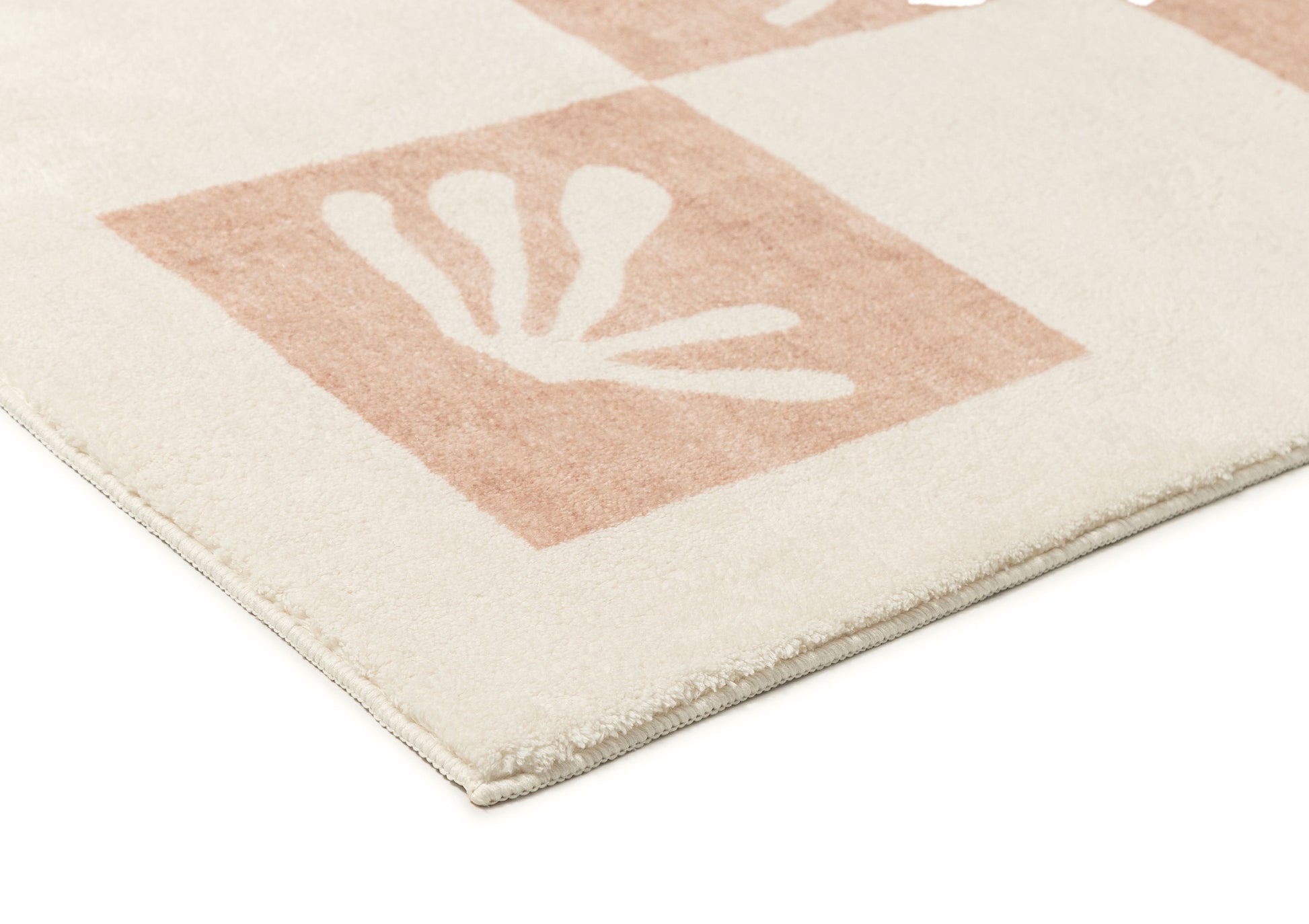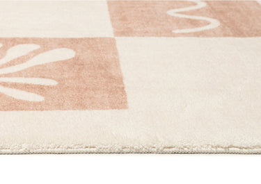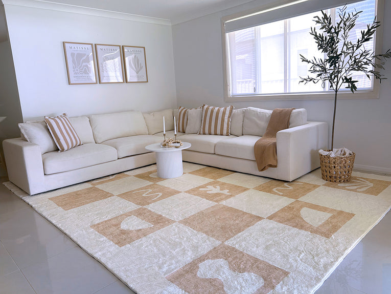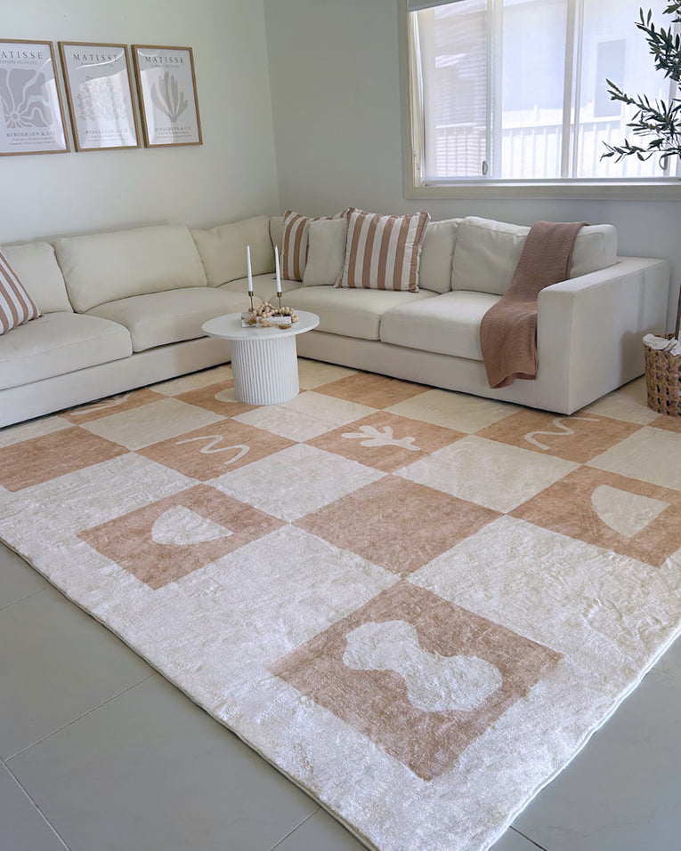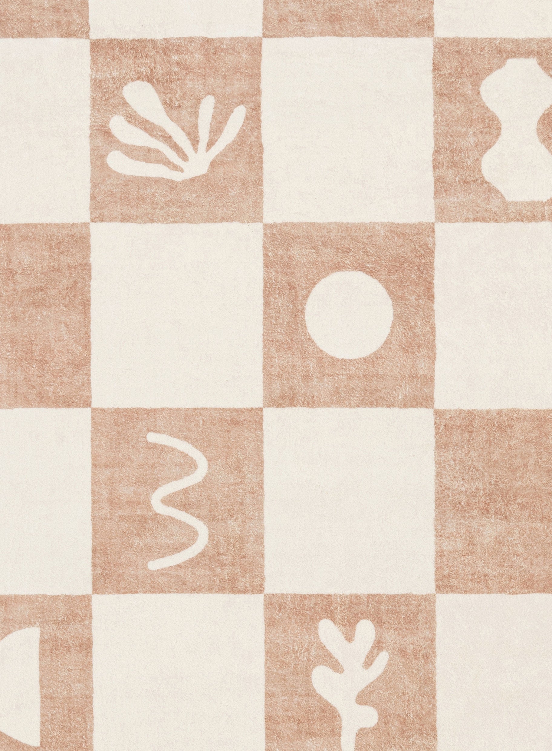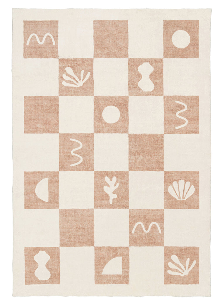 Erika is a gorgeous washable and foldable rug featuring hand-drawn ocean-inspired seashells and coral symbols with a checkered pattern in a neutral beige and cream tone. A timeless, modern, and unique design to add to any space.