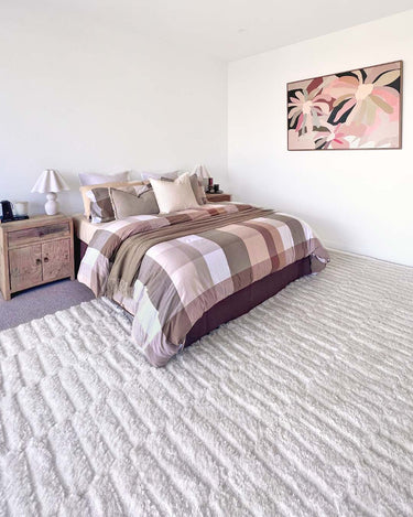 A rug introduces warmth and softness underfoot. Position it two-thirds under the bed, allowing it to extend beyond the sides and foot.