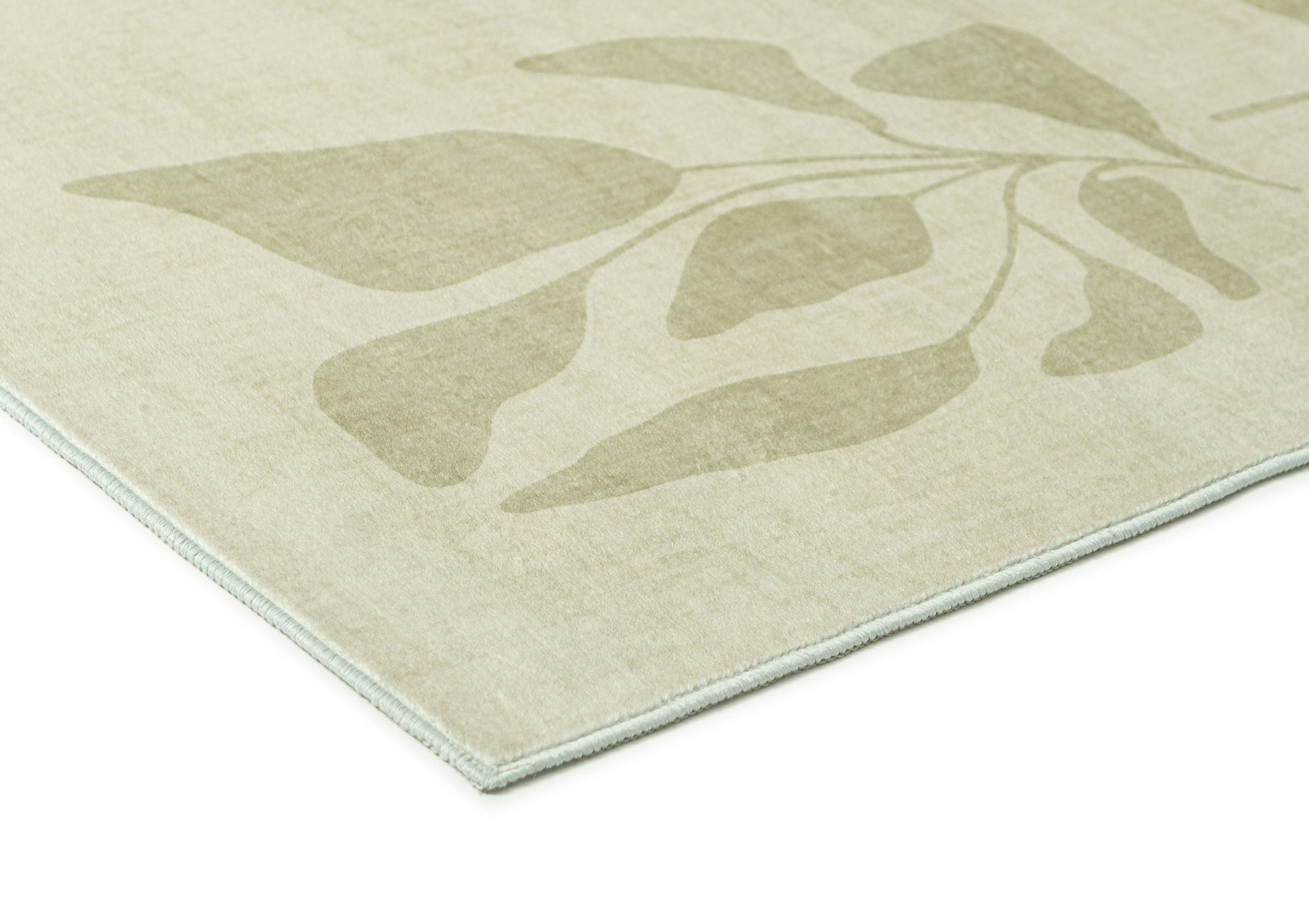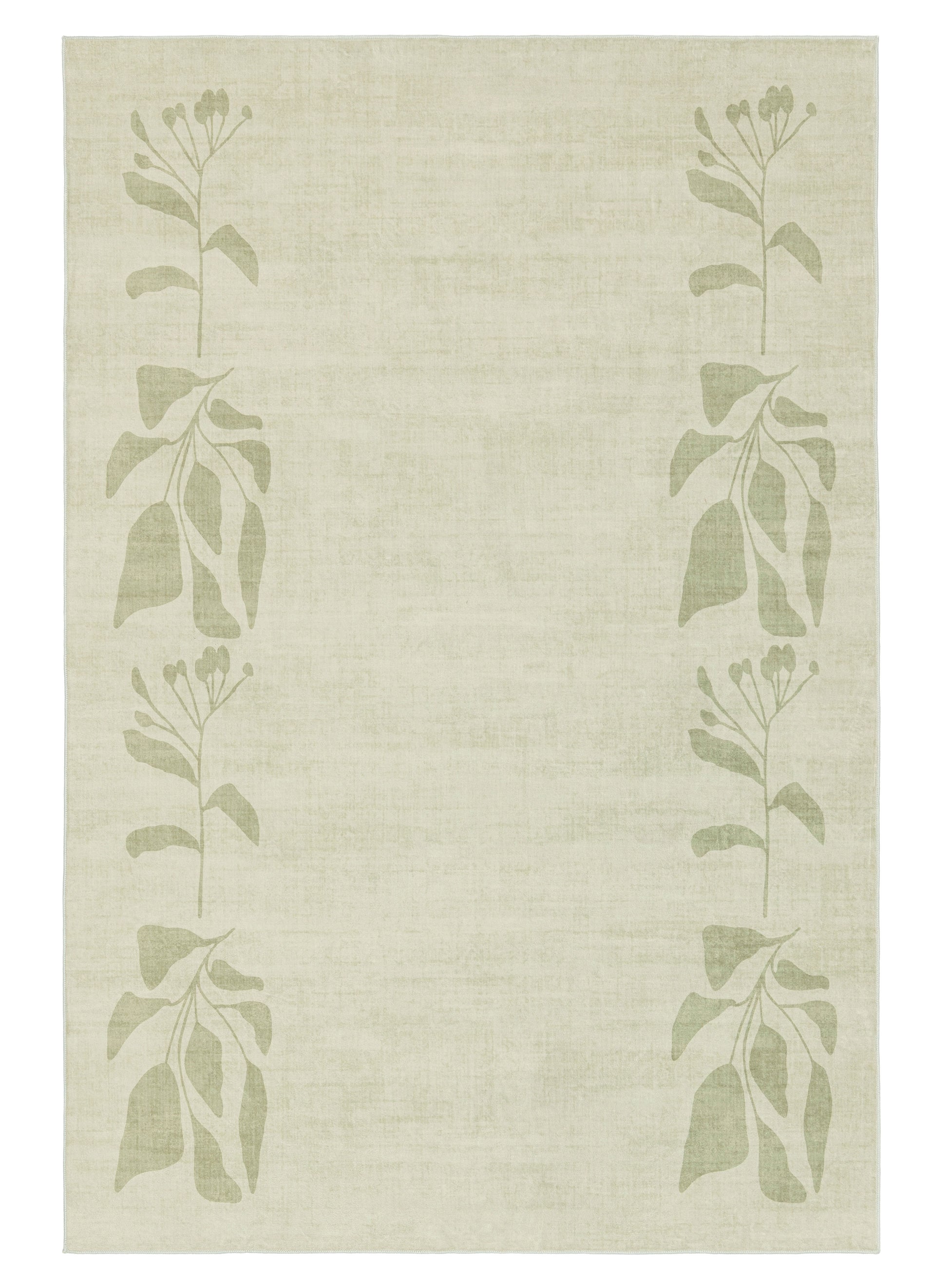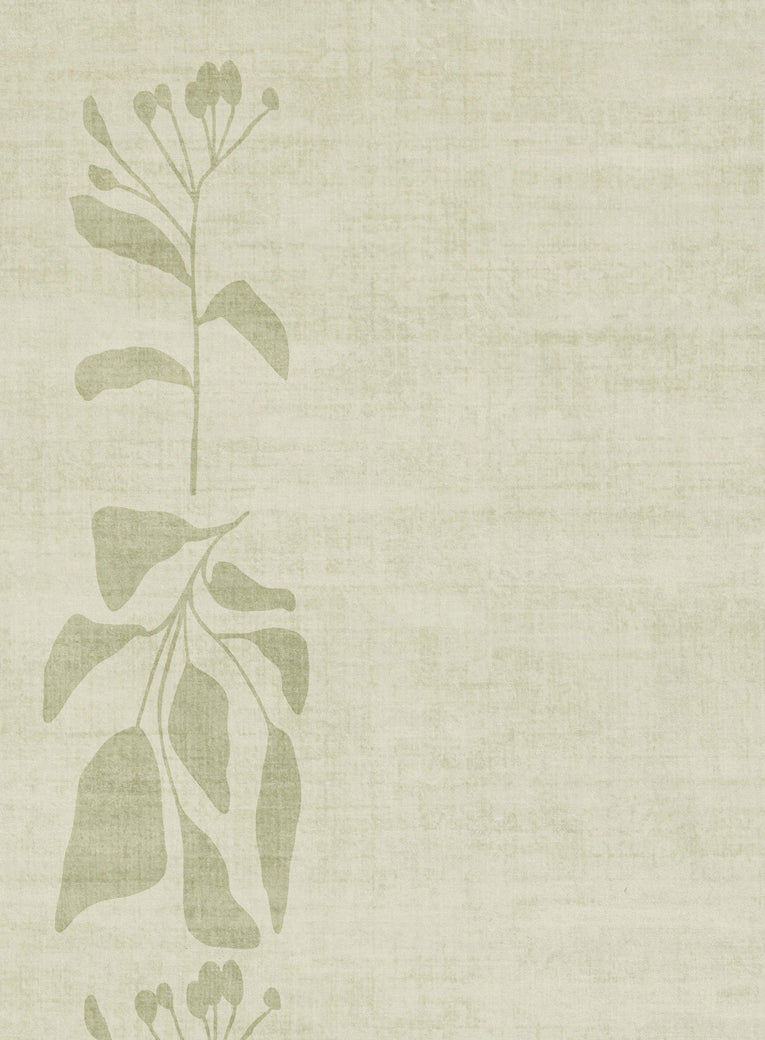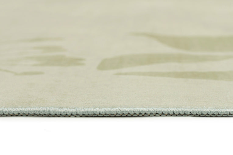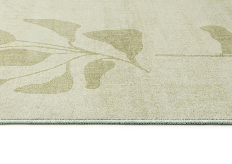 Glaiza is a washable and foldable rug defined by a soft botanical border that frames the space with a calm, nature-inspired rhythm. Subtle leafy forms sit against a muted green background, creating a composed design that feels quietly expressive.