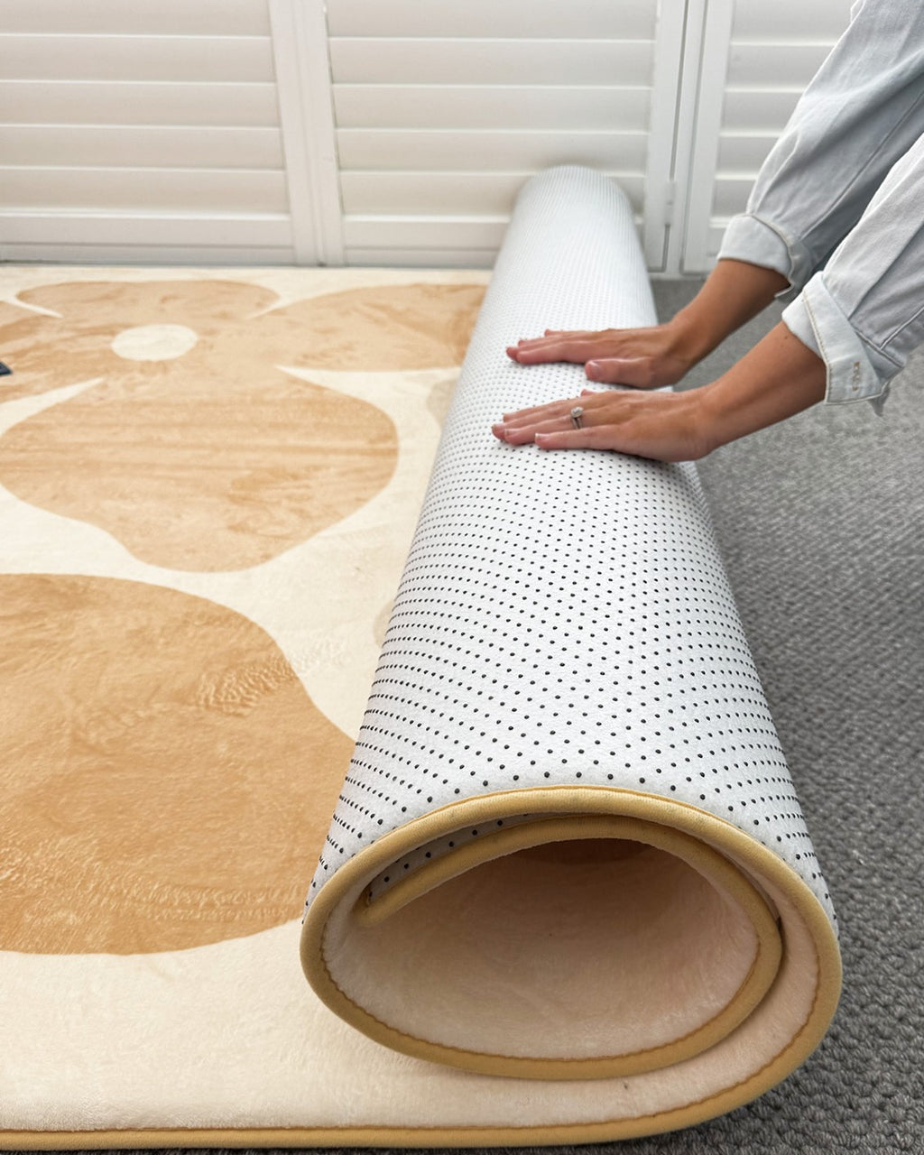 Our playmats are velvety soft to the touch with a luxe satin-smooth finish. They are thick and plush yet lightweight with a built-in non-slip underlay to keep the mat safe and in place.