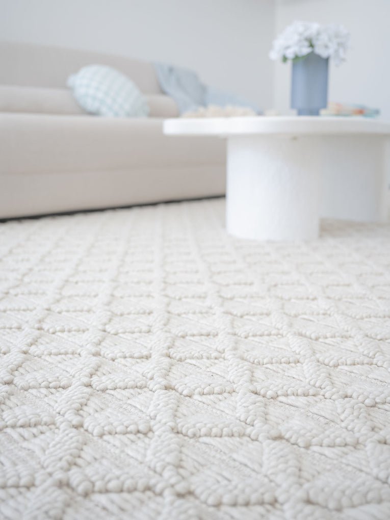 Inspired by Nature, Hanna is a contemporary wool blend rug in a gorgeous creamy ivory colour and embroidered leaflets pattern, designed in house and made exclusively for the Miss Amara Collection.
