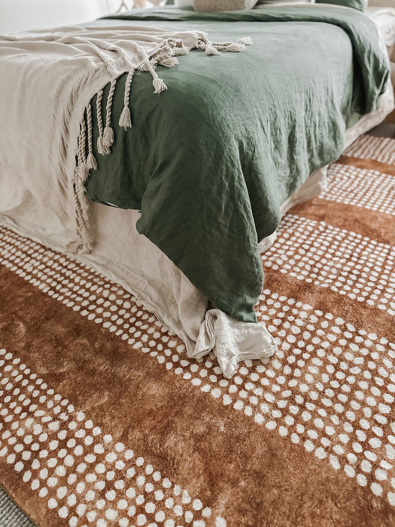 A rug introduces warmth and softness underfoot. Position it two-thirds under the bed, allowing it to extend beyond the sides and foot.