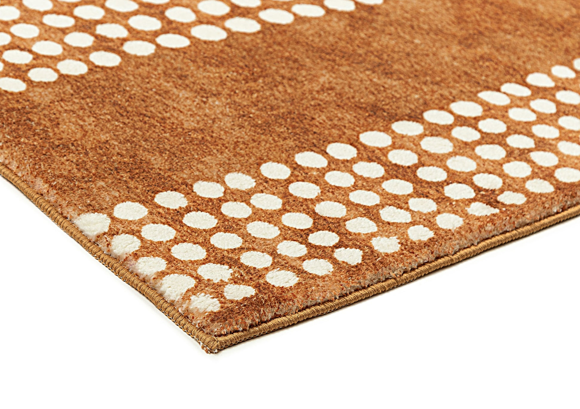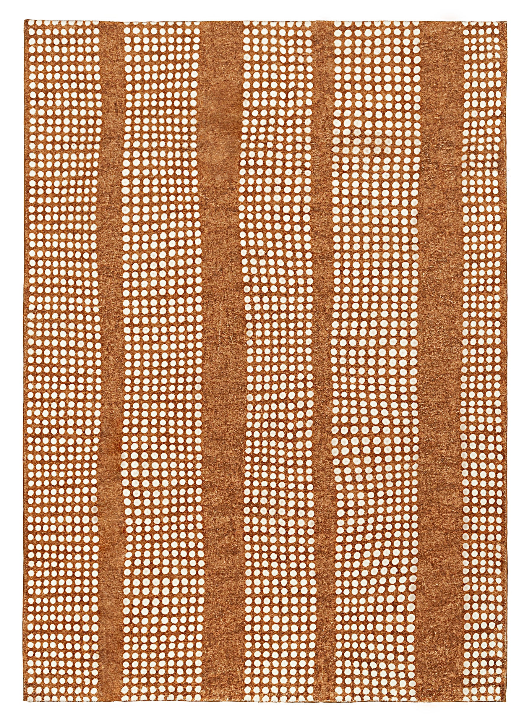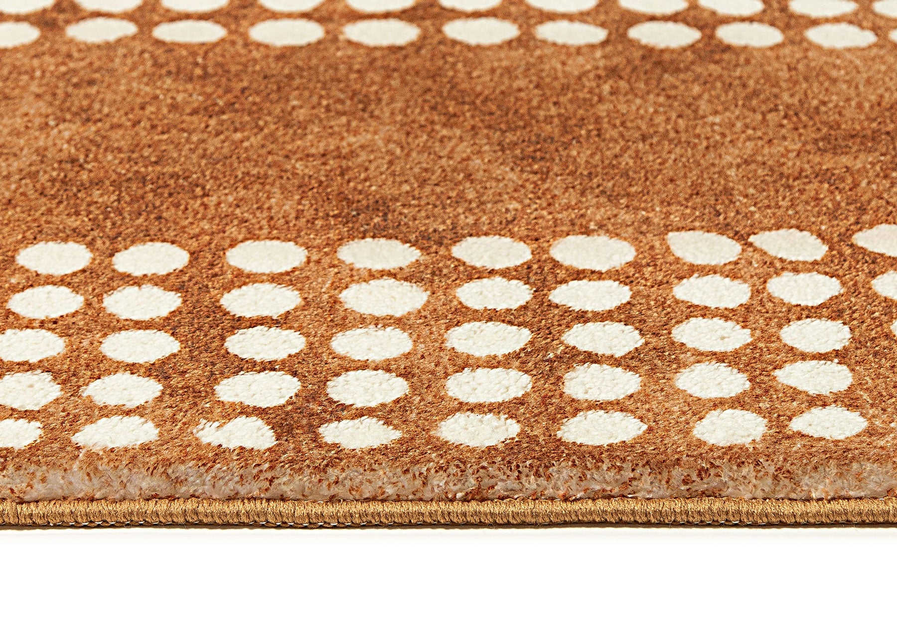 Hazrin is a unique soft plush machine washable and foldable rug featuring an abstract circle dotted line pattern in ivory cream on a rust brown background.