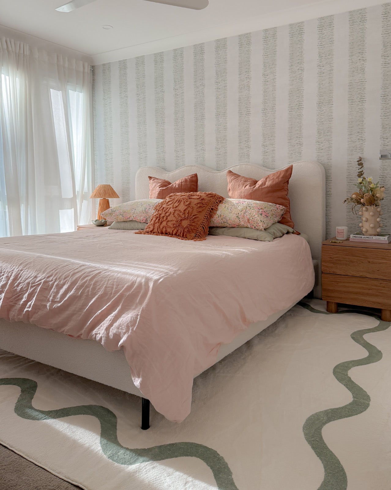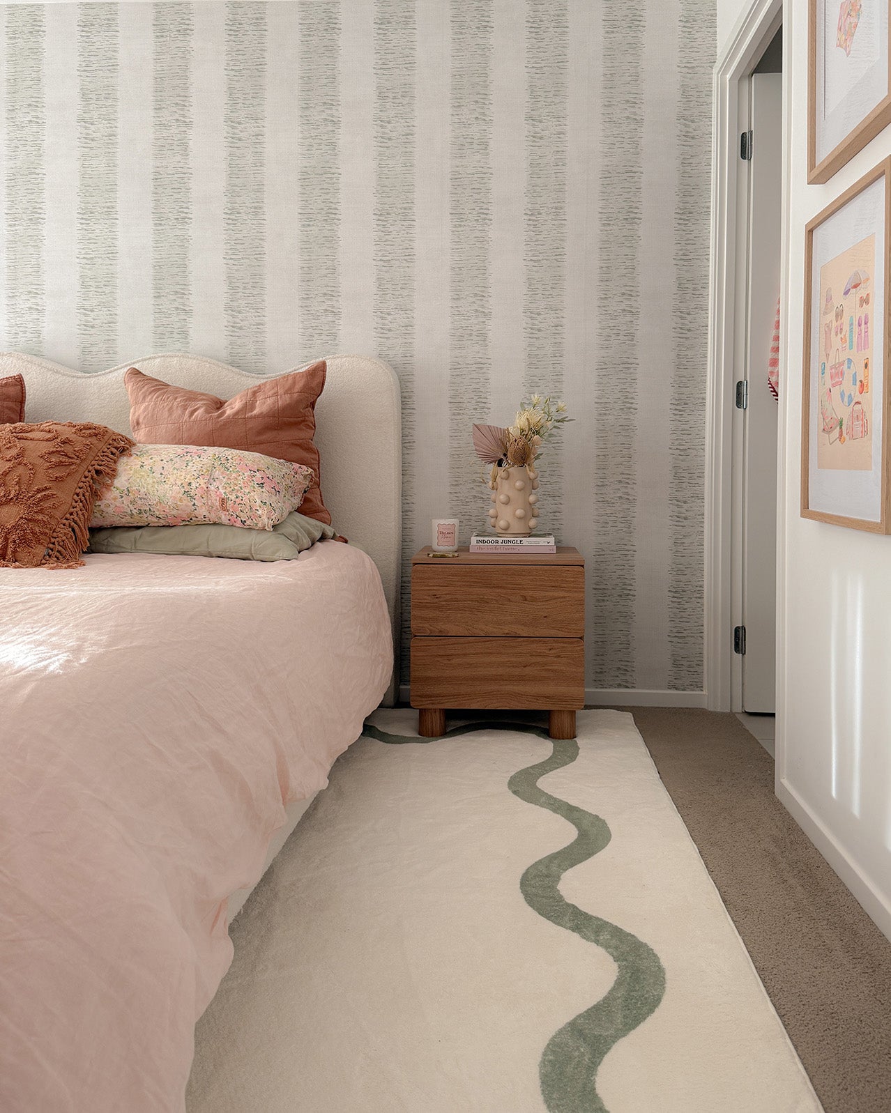 A rug introduces warmth and softness underfoot. Position it two-thirds under the bed, allowing it to extend beyond the sides and foot.