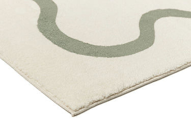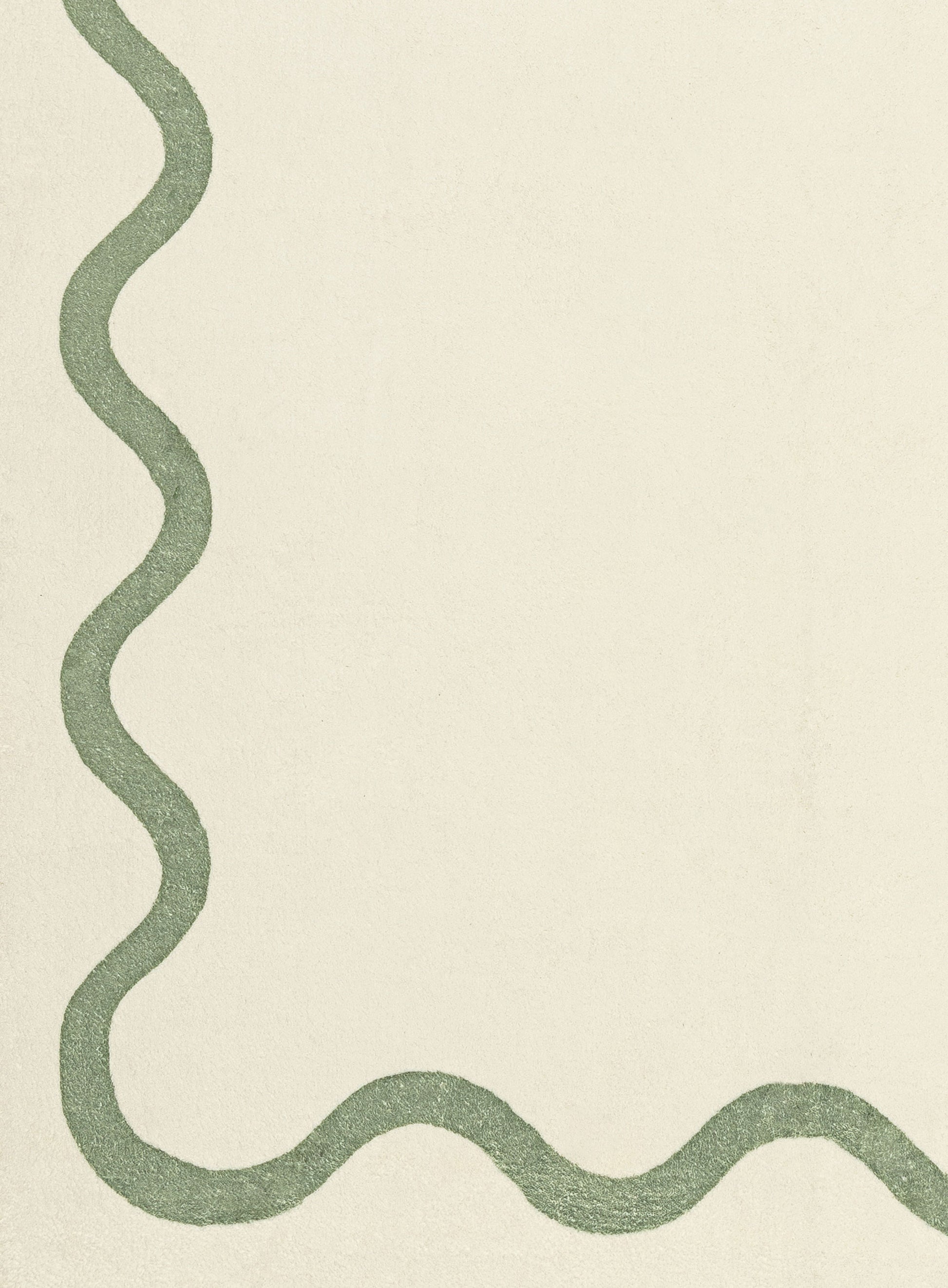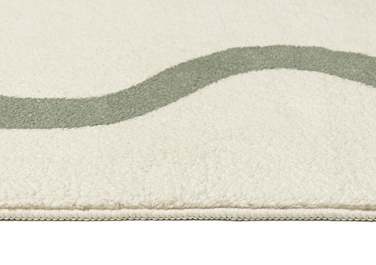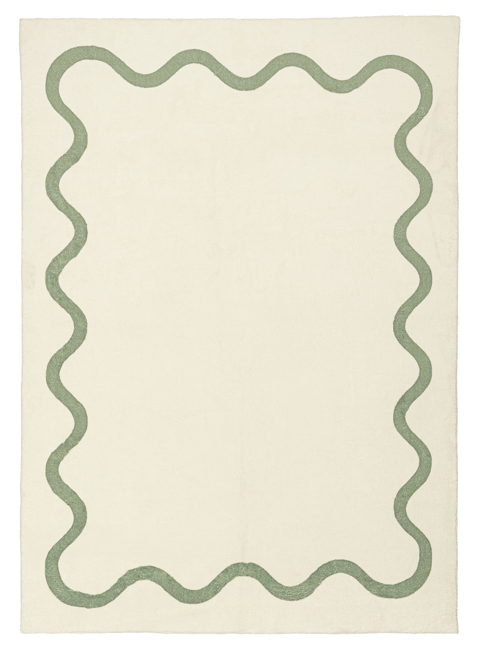Jamie is a gorgeous washable and foldable rug featuring a wave squiggle border pattern in green on an ivory base. A fun, modern and unique design to add to any space.