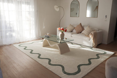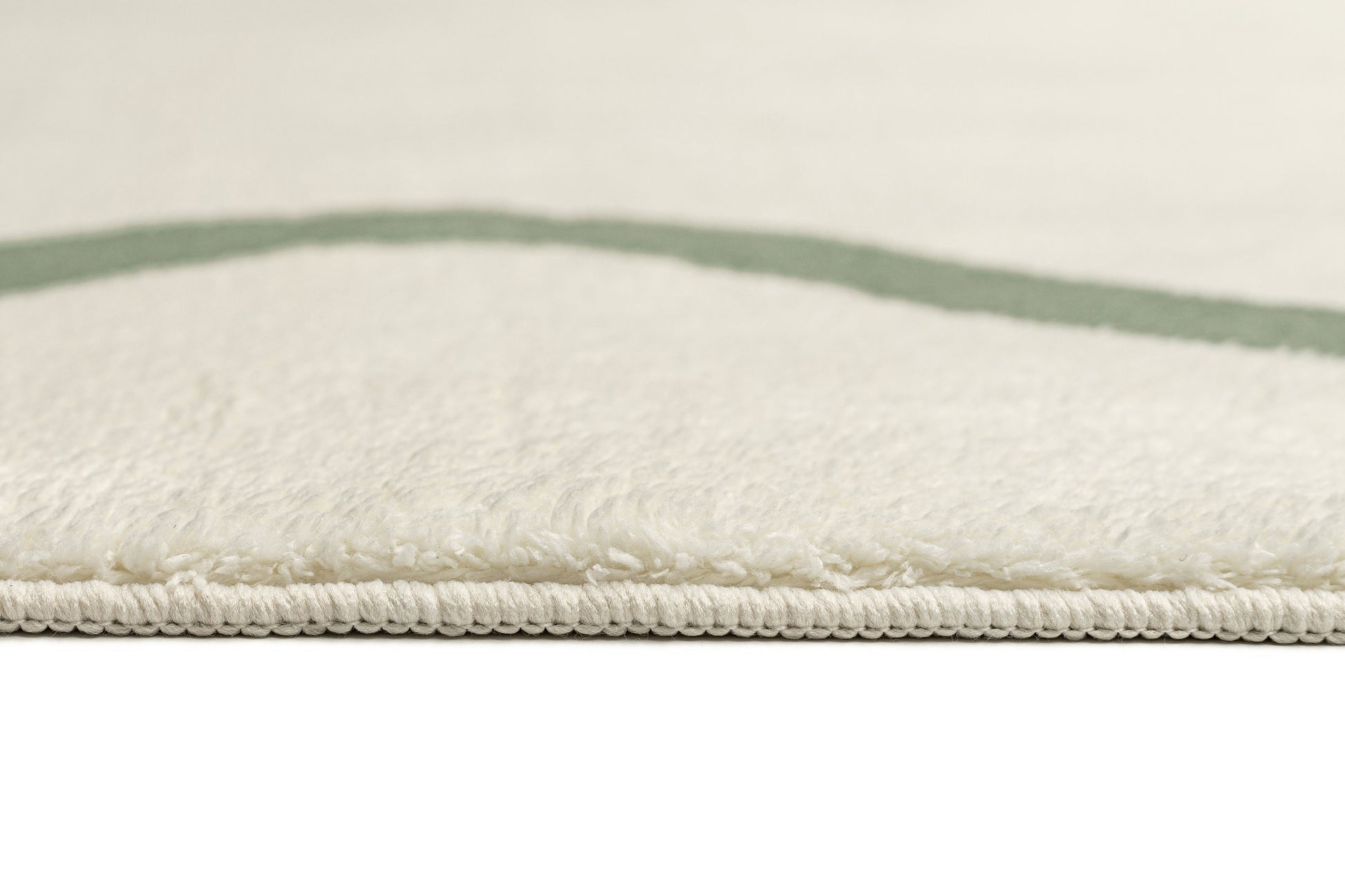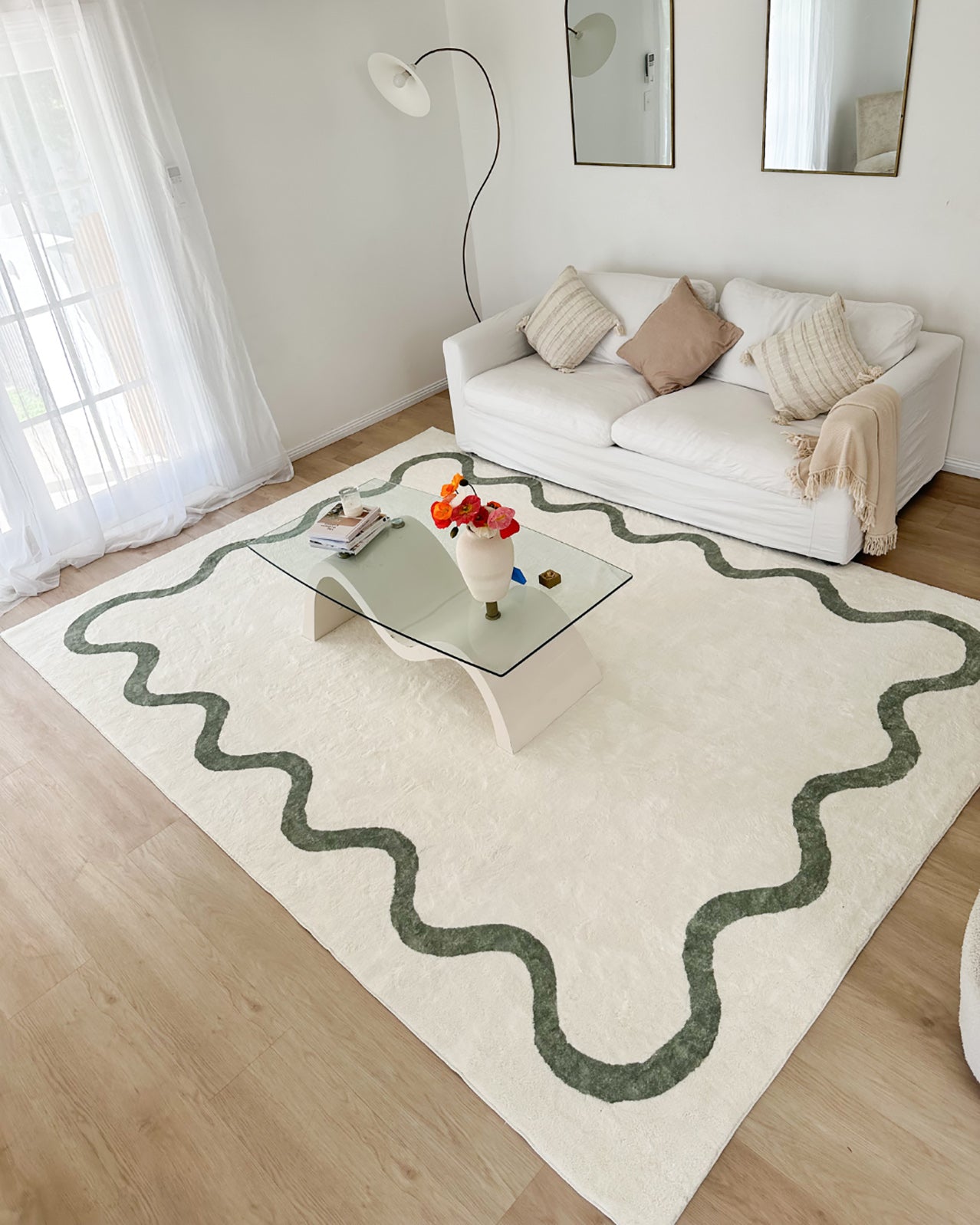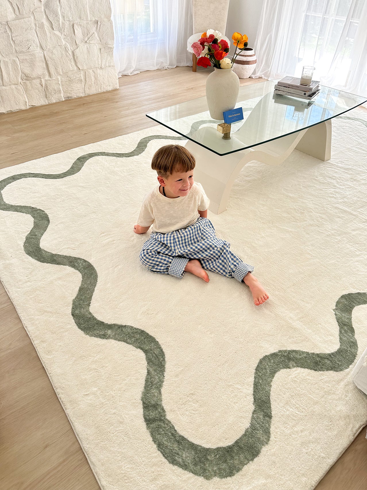 Jamie is a gorgeous washable and foldable rug featuring a wave squiggle border pattern in green on an ivory base. A fun, modern and unique design to add to any space.