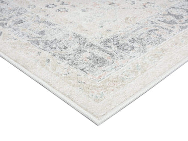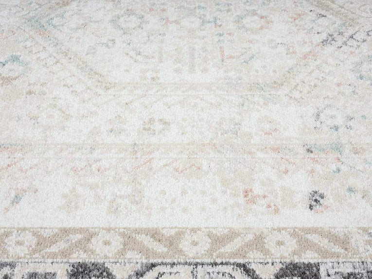 An exclusive design in the Miss Amara Collection, Katya is a bordered vintage distressed style. Decorated with elaborate floral motifs and ornate patterns in transitional multi-tones of ivory, grey, powder blue and pastel pink. A timeless and elegant addition to a modern, classic, bohemian or vintage space.