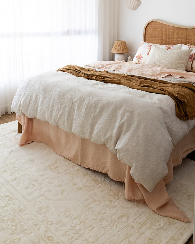 A rug introduces warmth and softness underfoot. Position it two-thirds under the bed, allowing it to extend beyond the sides and foot.