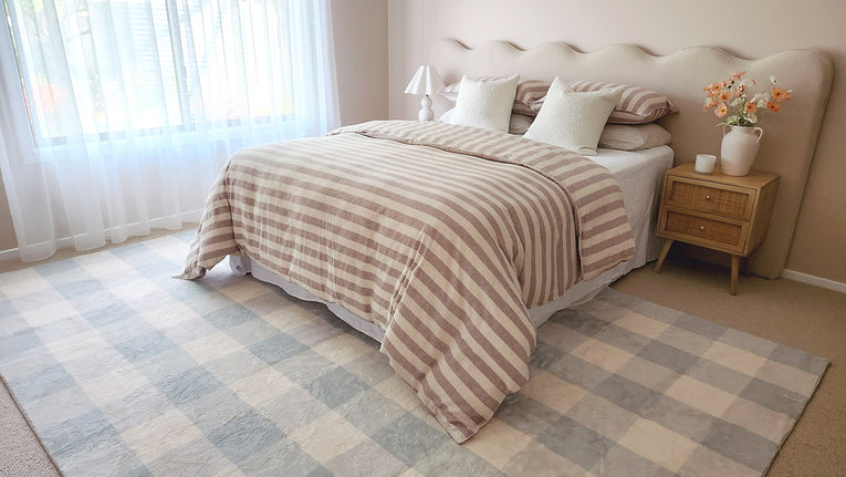 A rug introduces warmth and softness underfoot. Position it two-thirds under the bed, allowing it to extend beyond the sides and foot.