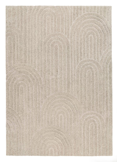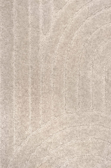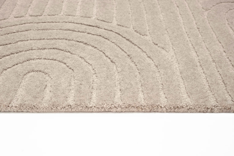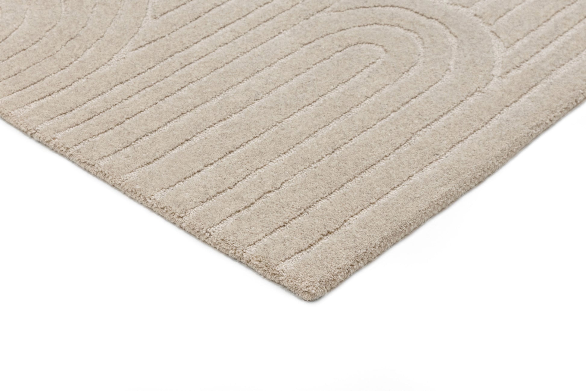 Moraya is a beige hand-tufted wool rug with contemporary rainbow pattern.