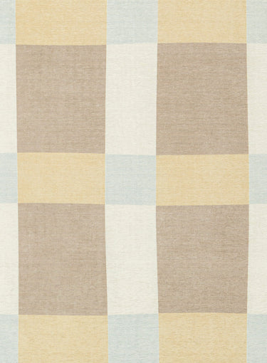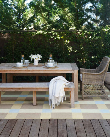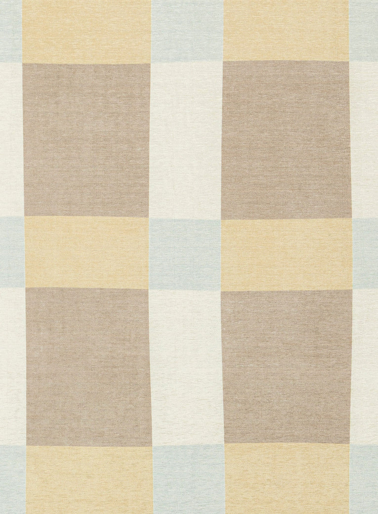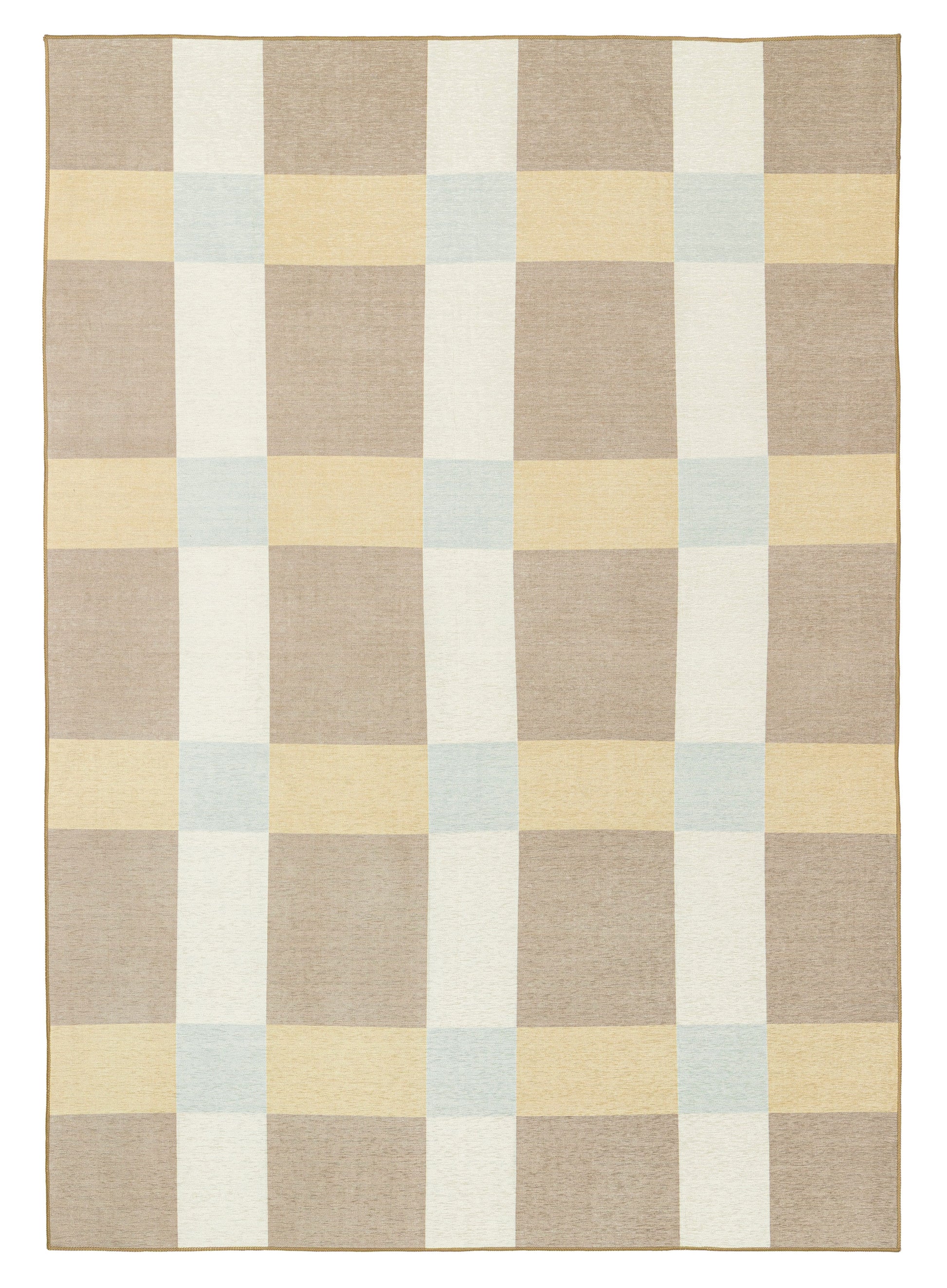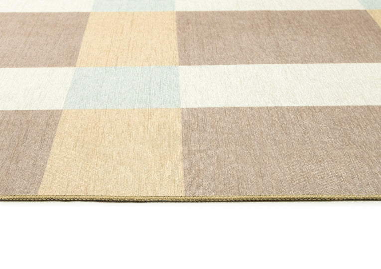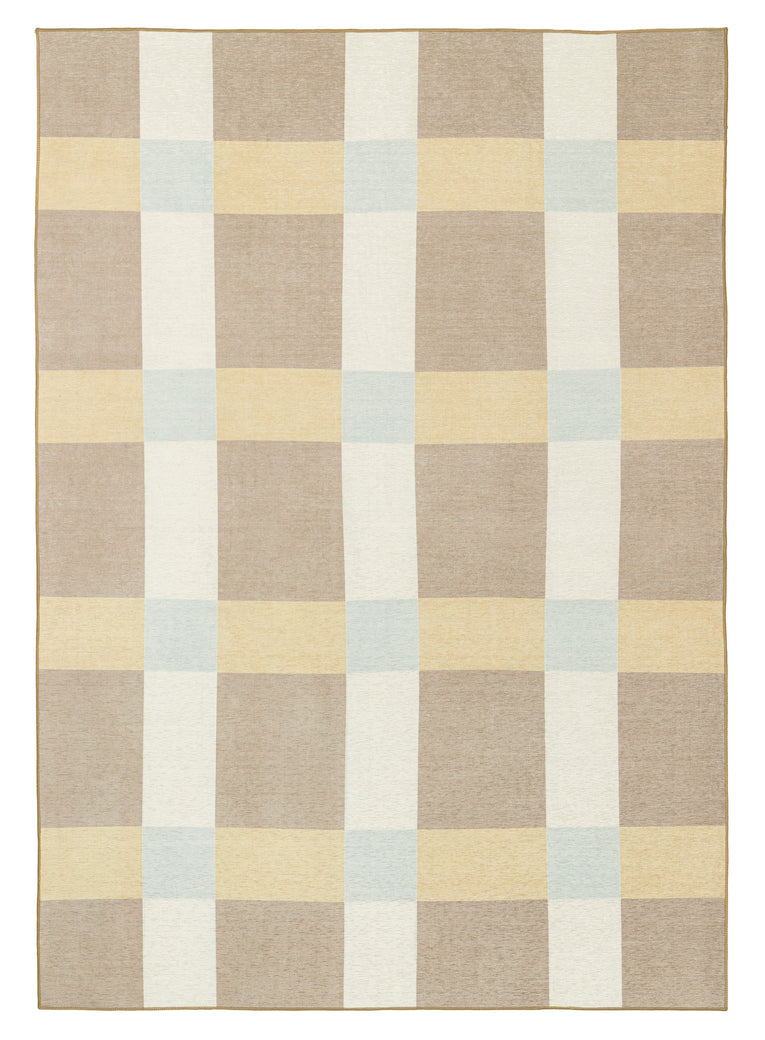 Nice is a contemporary indoor outdoor rug featuring a bold oversized check pattern in warm beige, golden sand, ivory, and soft sky blue.