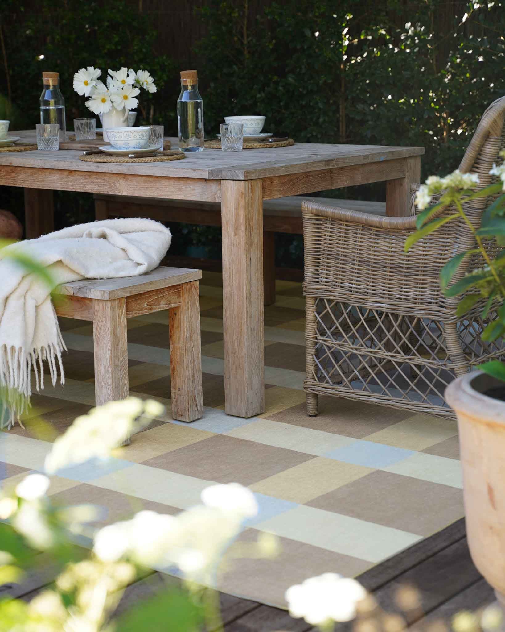 Define your alfresco area as you would indoors. Keep the front legs of outdoor furniture on the rug to frame the setting.