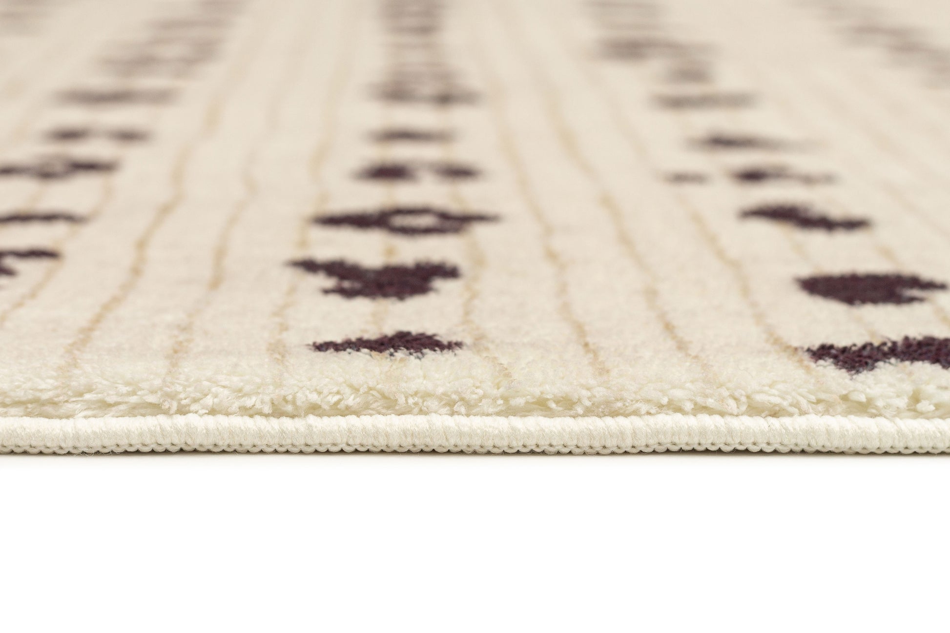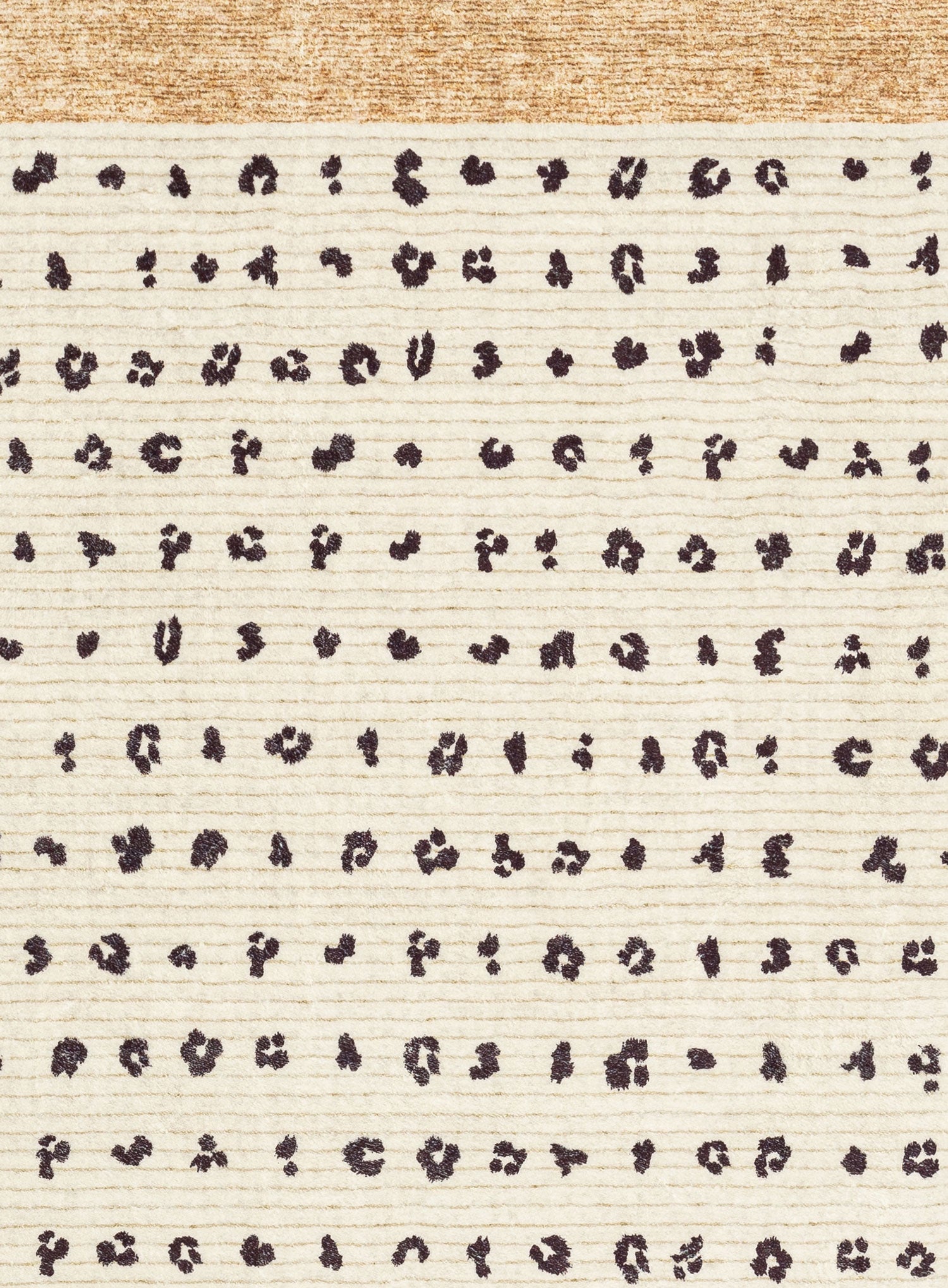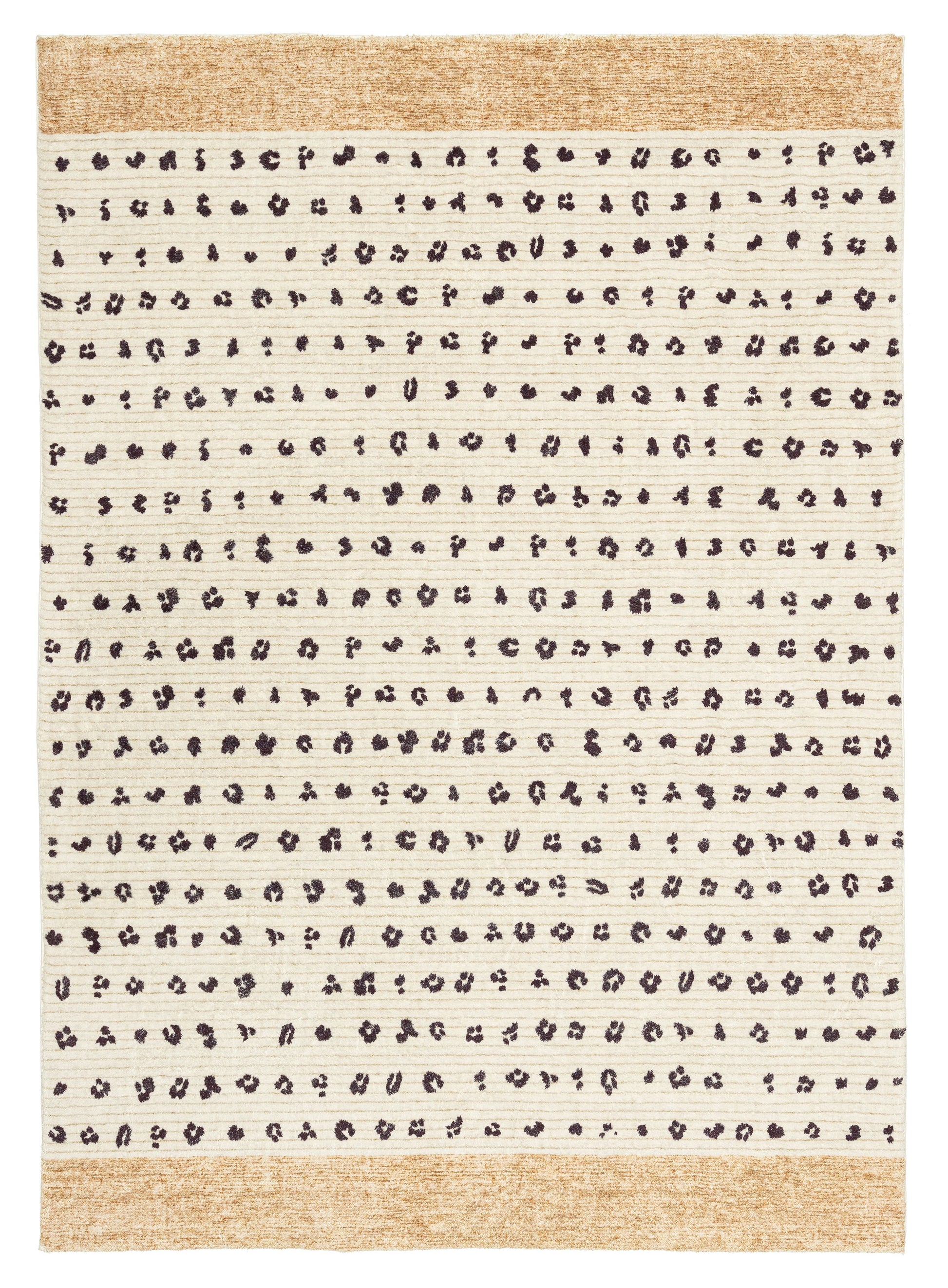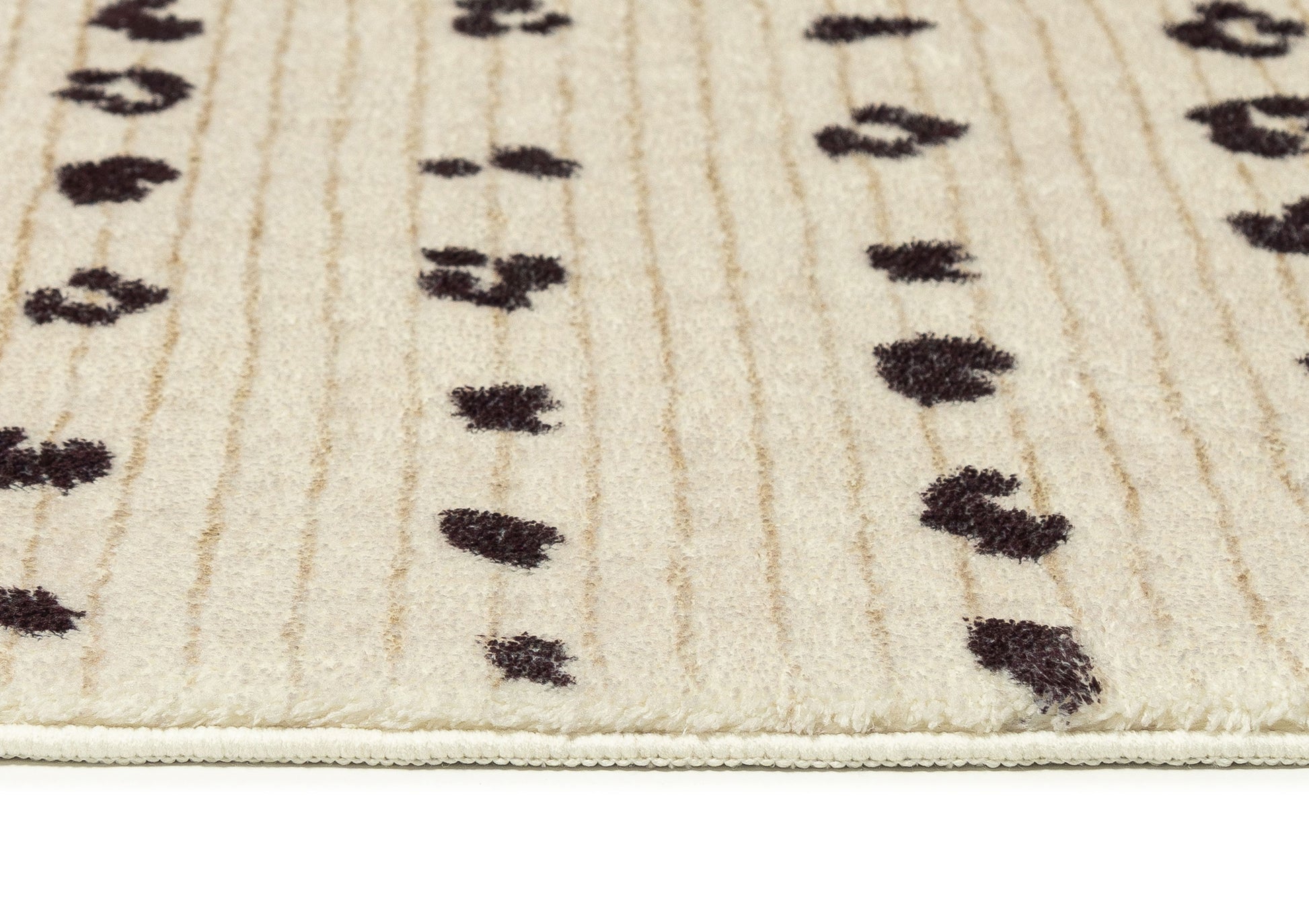 Odette is a unique soft plush machine washable and foldable rug featuring an animal stripe pattern in charcoal on a background of cream with brown border ends.