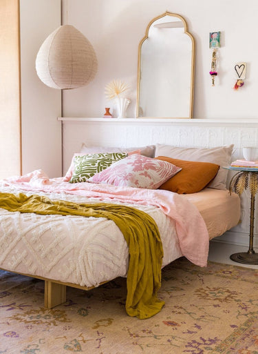 A rug introduces warmth and softness underfoot. Position it two-thirds under the bed, allowing it to extend beyond the sides and foot.