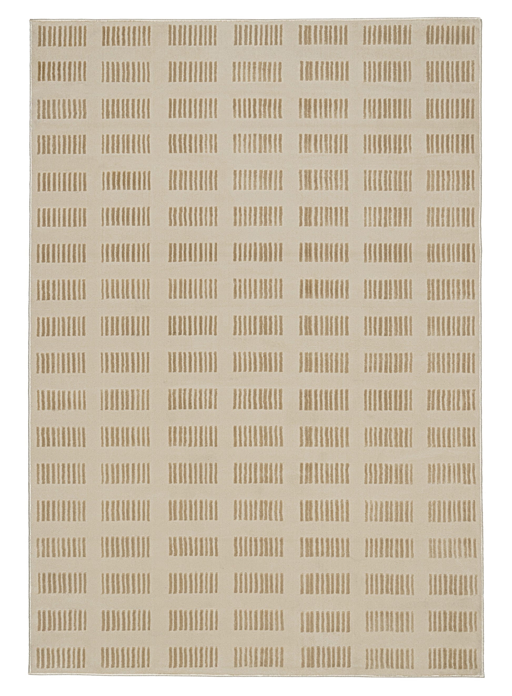 Ouargia is a luxe foldable rug featuring a high low textured modern geometric line design in neutral beige cream tones. A timeless, modern and unique design to add to any space.