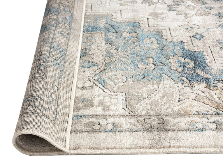 Rhona is a beautiful blue, grey and beige rug in a traditional distressed medallion style with a bordered floral motif.