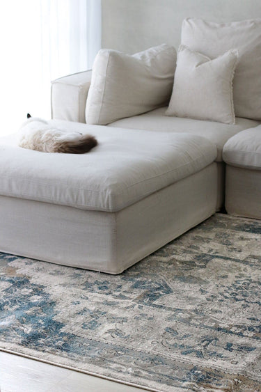 An exclusive design in the Miss Amara Collection, Rhona features a distressed look to give it a vintage feel. Decorated with elaborate floral motifs and ornate patterns in transitional tones of blue, grey and ivory with hints of beige. A timeless and elegant addition to a modern, classic, bohemian or vintage space.