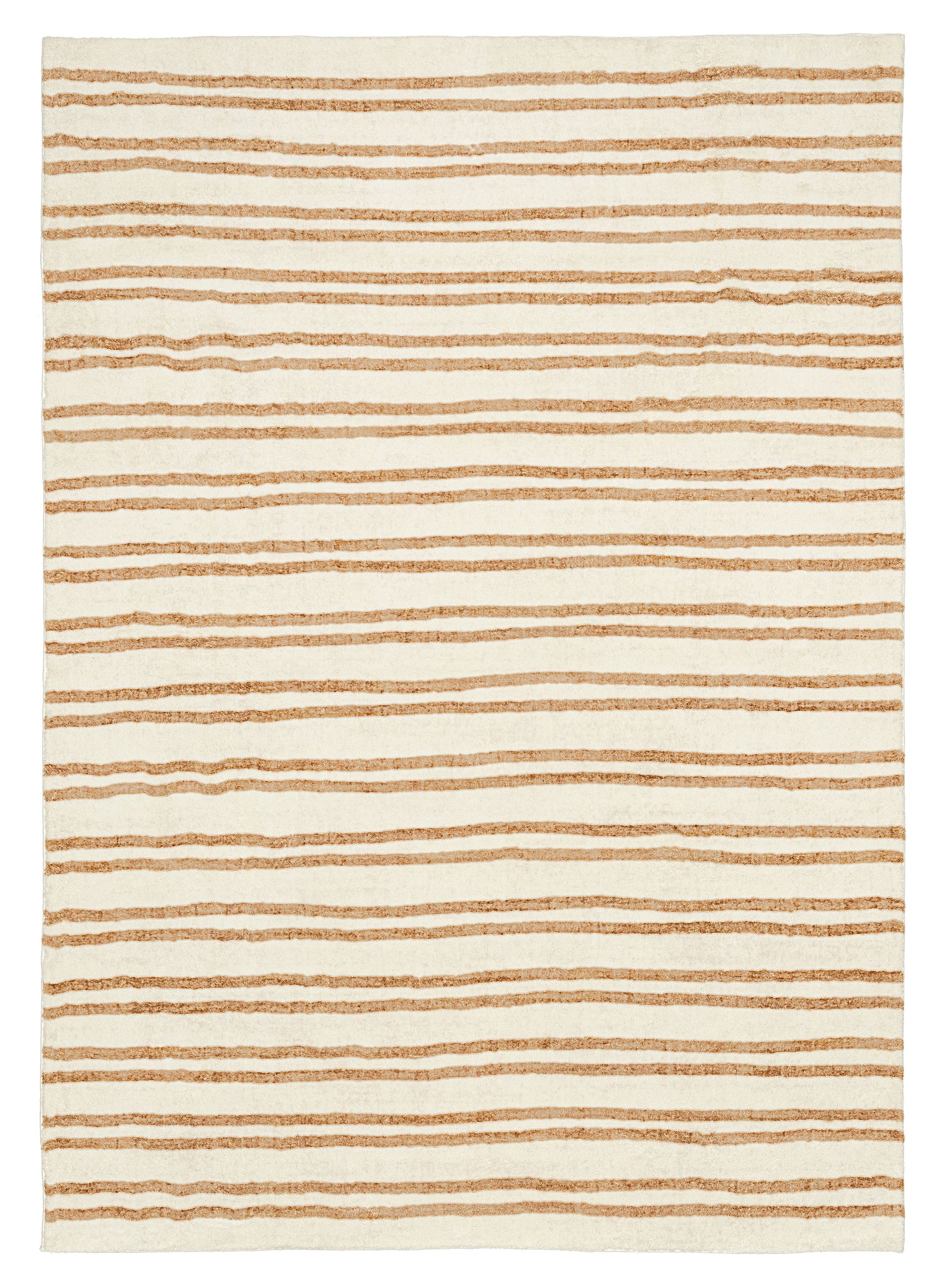 Rhow is a stunning neutral soft plush machine washable and foldable rug featuring a double striped line pattern in warm brown with a base of cream.