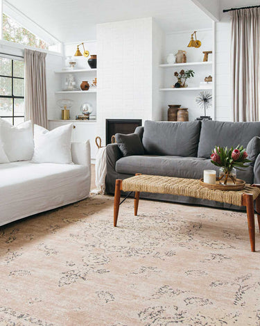 A truly unique design piece, Sadie is a flatweave style transitional rug featuring a soft coral peach backdrop and traditional medallion design.
