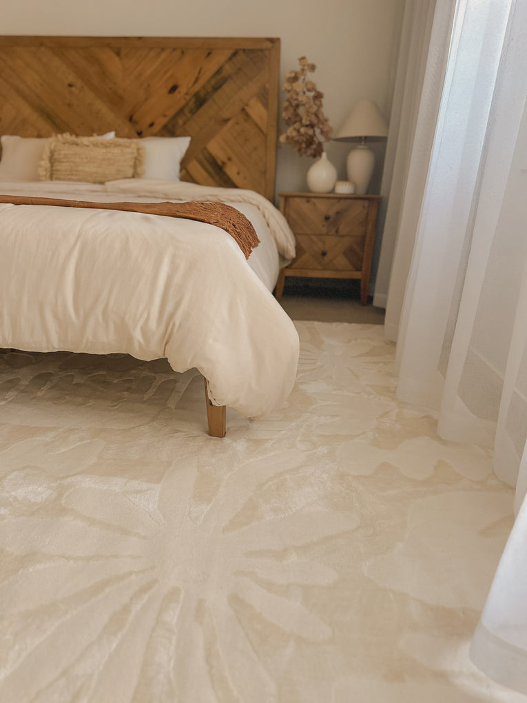A rug introduces warmth and softness underfoot. Position it two-thirds under the bed, allowing it to extend beyond the sides and foot.