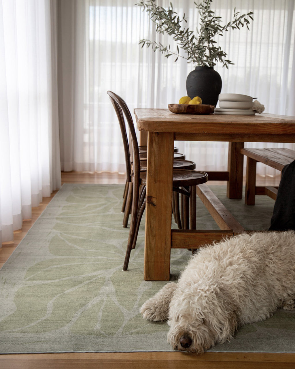Savona is a smooth, machine-washable, and foldable flatweave rug in cool green tones with an abstract botanical design. A versatile and timeless addition to any space.