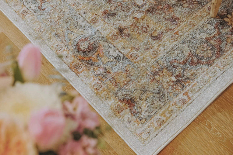 Summer is a gorgeous cream blue and orange traditional distressed rug with a beautiful multi-toned floral motif.