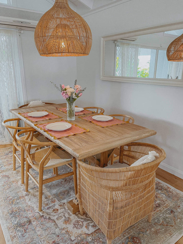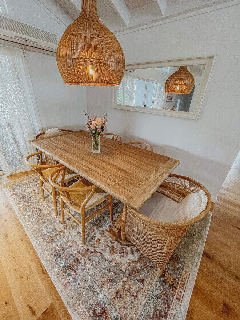 Your rug should sit fully beneath the table and chairs, even when chairs are pulled out.