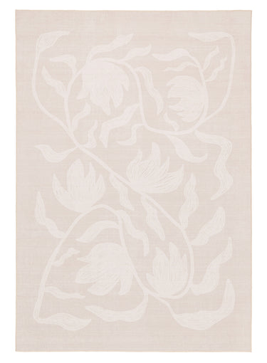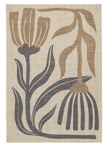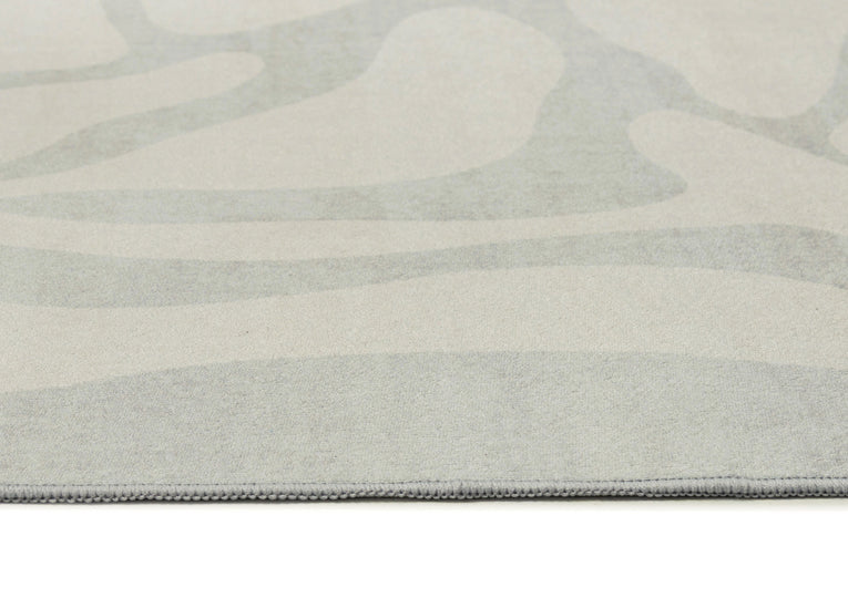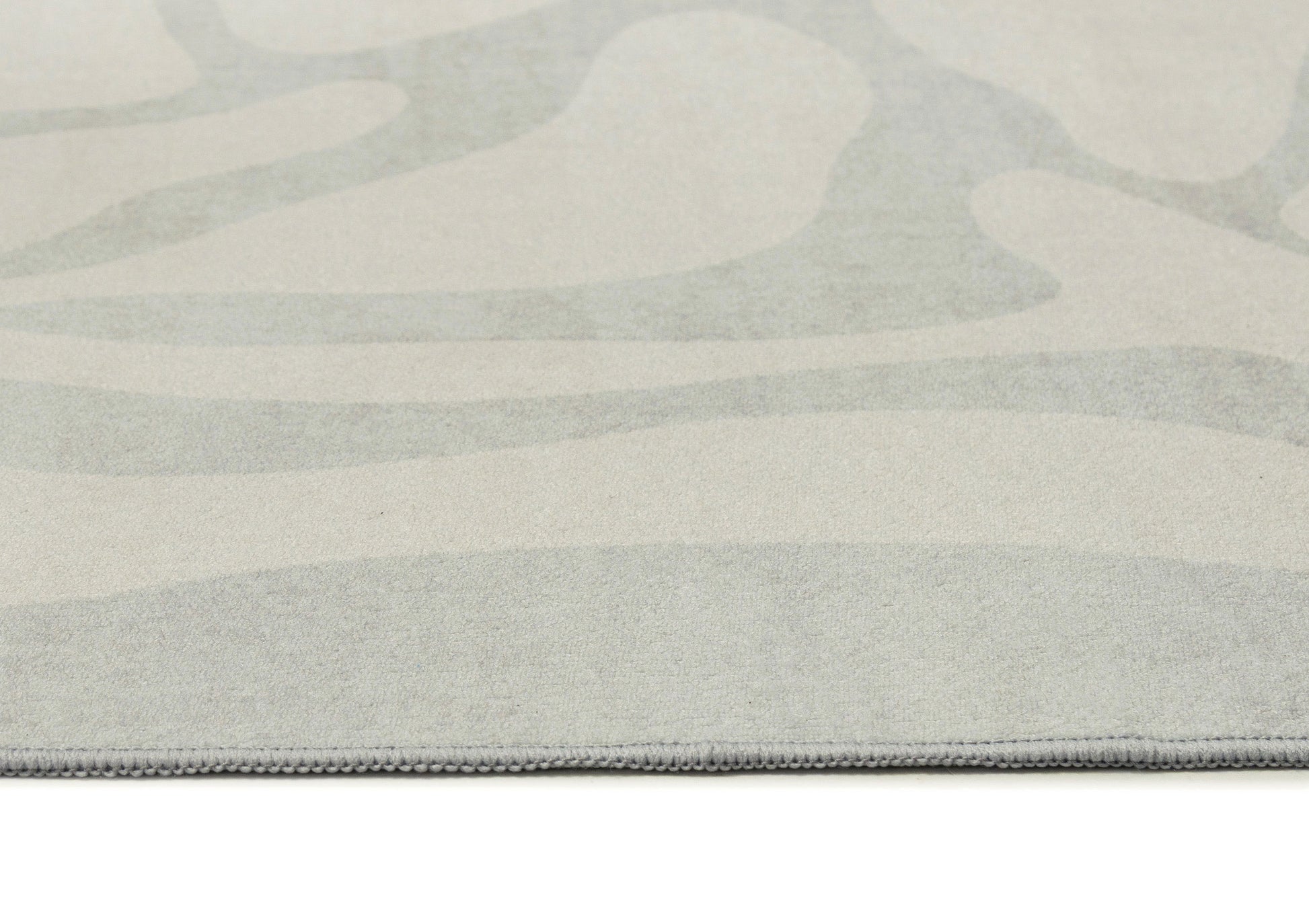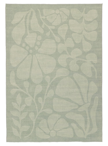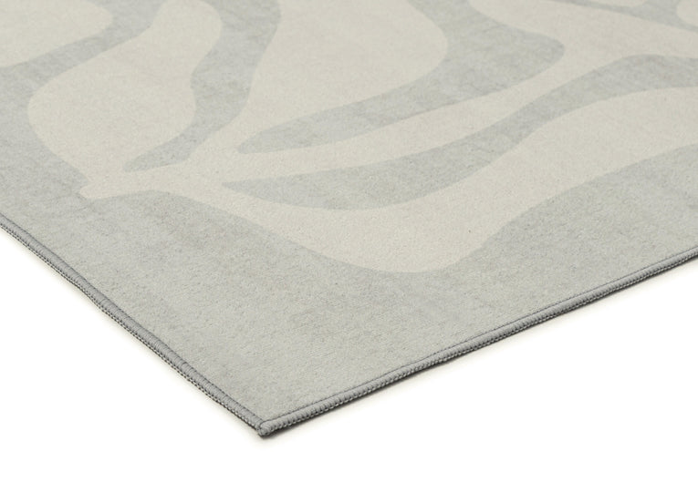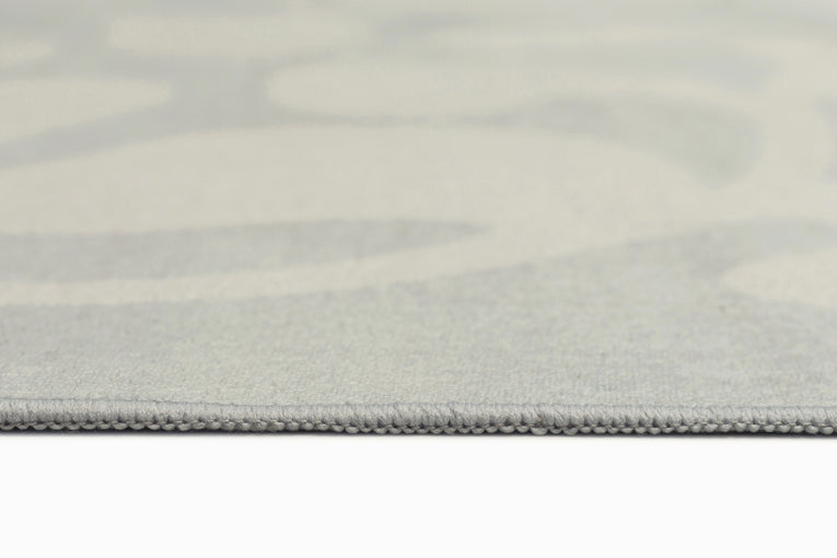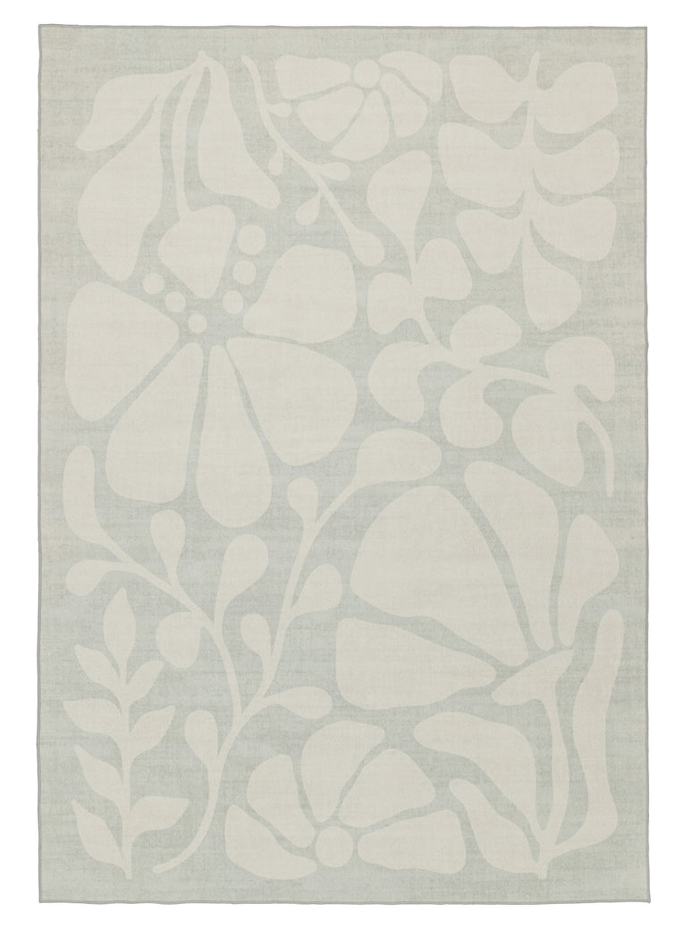Tani is a smooth, machine-washable, and foldable flatweave rug in light grey and blue tones with an abstract botanical design. A versatile and timeless addition to any space.