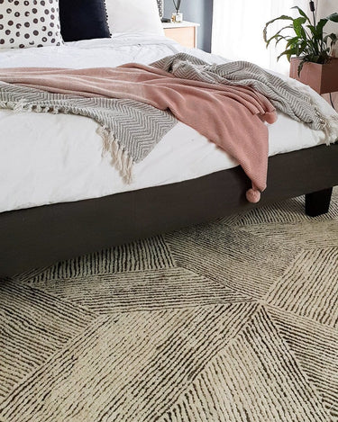 A rug introduces warmth and softness underfoot. Position it two-thirds under the bed, allowing it to extend beyond the sides and foot.