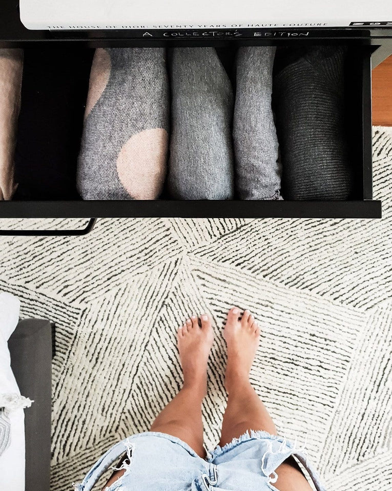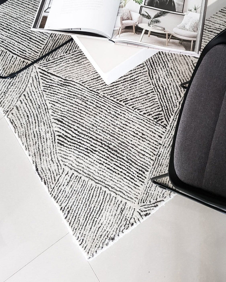 The bold charcoal and ivory colourway would create a stunning anchor in any space, adding an element of monochromatic elegance and subtle tribal vibe to your interior.