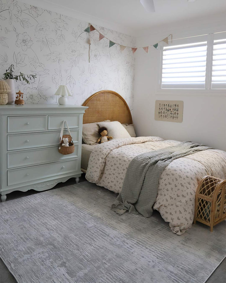 A rug introduces warmth and softness underfoot. Position it two-thirds under the bed, allowing it to extend beyond the sides and foot.