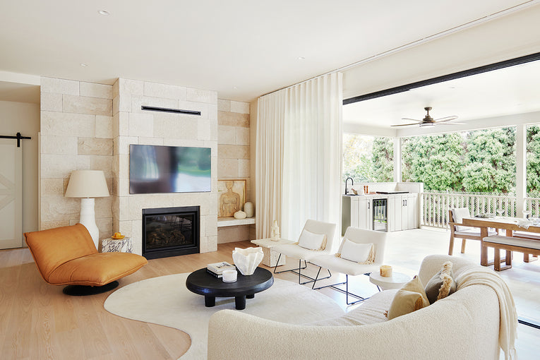 Position your rug to frame the seating area as one considered zone. Place at least the front legs of your sofa and chairs on the rug to anchor the layout.