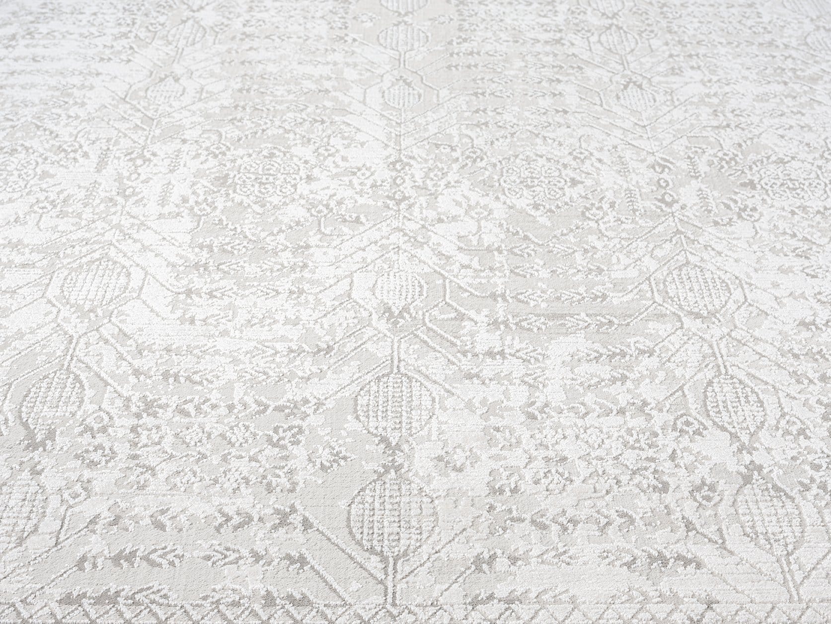 An exclusive design in the Miss Amara Collection, a distressed style decorated with elaborate floral motifs in transitional multi-tones of grey and ivory. Featuring an intentionally created distressed look to give it a vintage feel (a treatment called 'abrash' to describe colour variations common in antique rugs). A timeless and elegant addition to a modern, tribal, coastal, bohemian or vintage space.