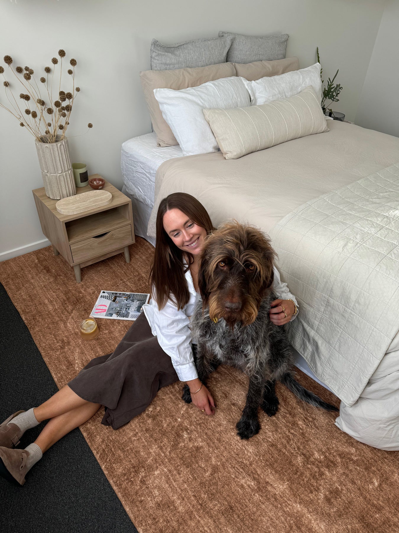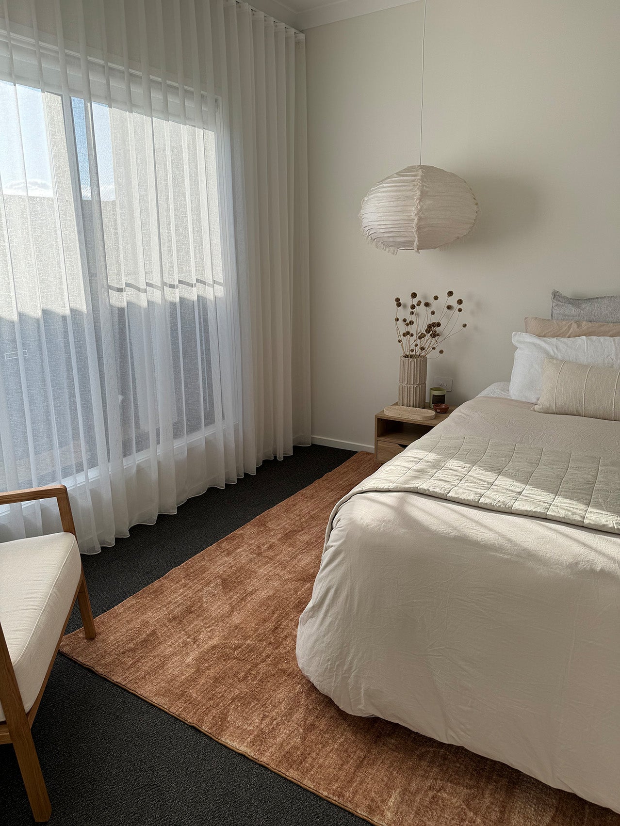 A rug introduces warmth and softness underfoot. Position it two-thirds under the bed, allowing it to extend beyond the sides and foot.